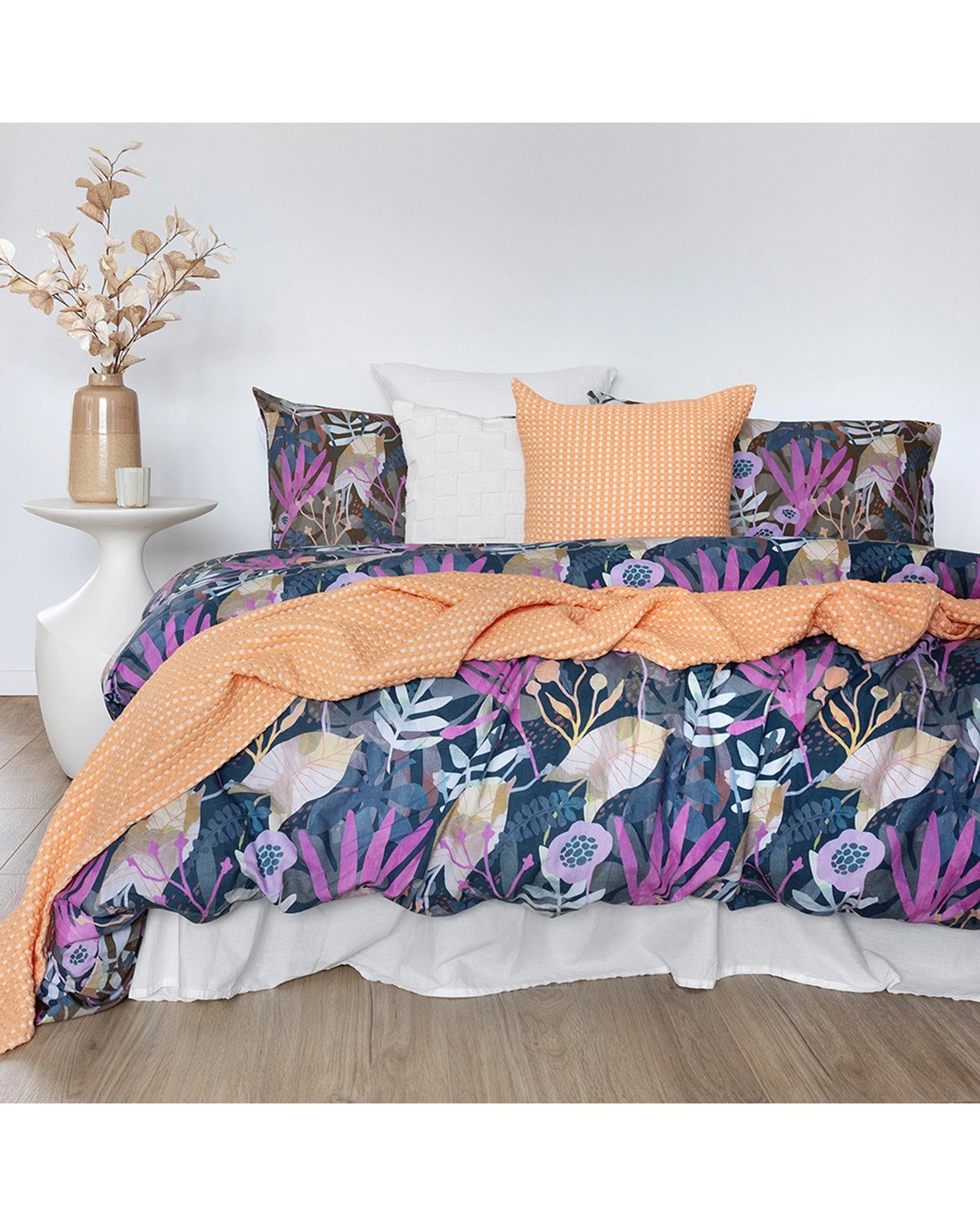The BAMBURY Queen Hana Cotton Quilt Cover set is designed for adding vibrant style and comfort to your bedroom. Crafted from 100% washed cotton, this reversible bedding set features a striking botanical print that can be flipped to reveal a different colour background, offering versatile styling options to suit your mood or decor.