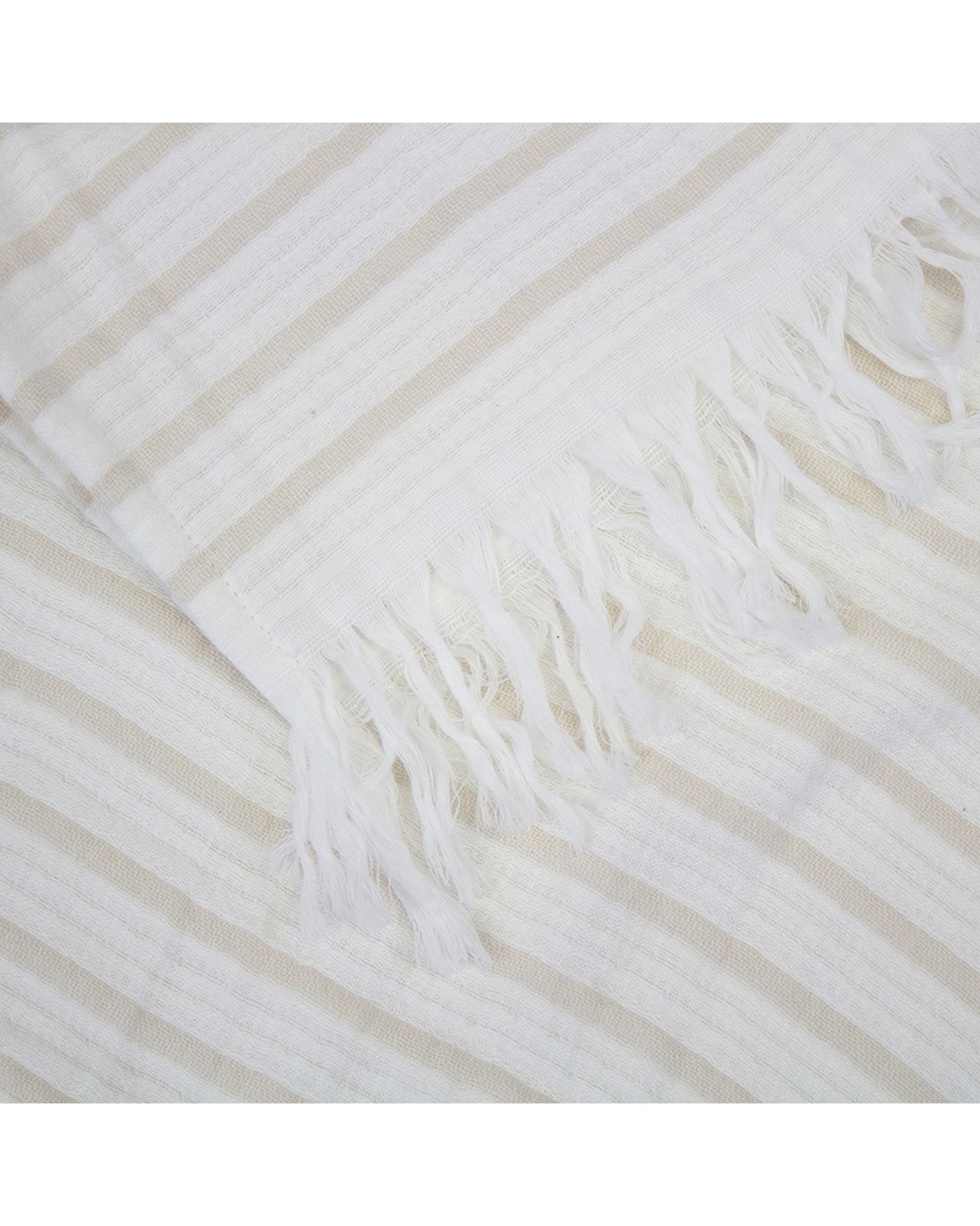 Made from 90% cotton and 10% bamboo, it features a timeless stripe design that complements various decor styles. The throw is finished with fringed edges at both ends, adding a decorative touch to its functional design. Its generous size of approximately 130 x 200cm makes it suitable for sofas, beds, or lounging areas.