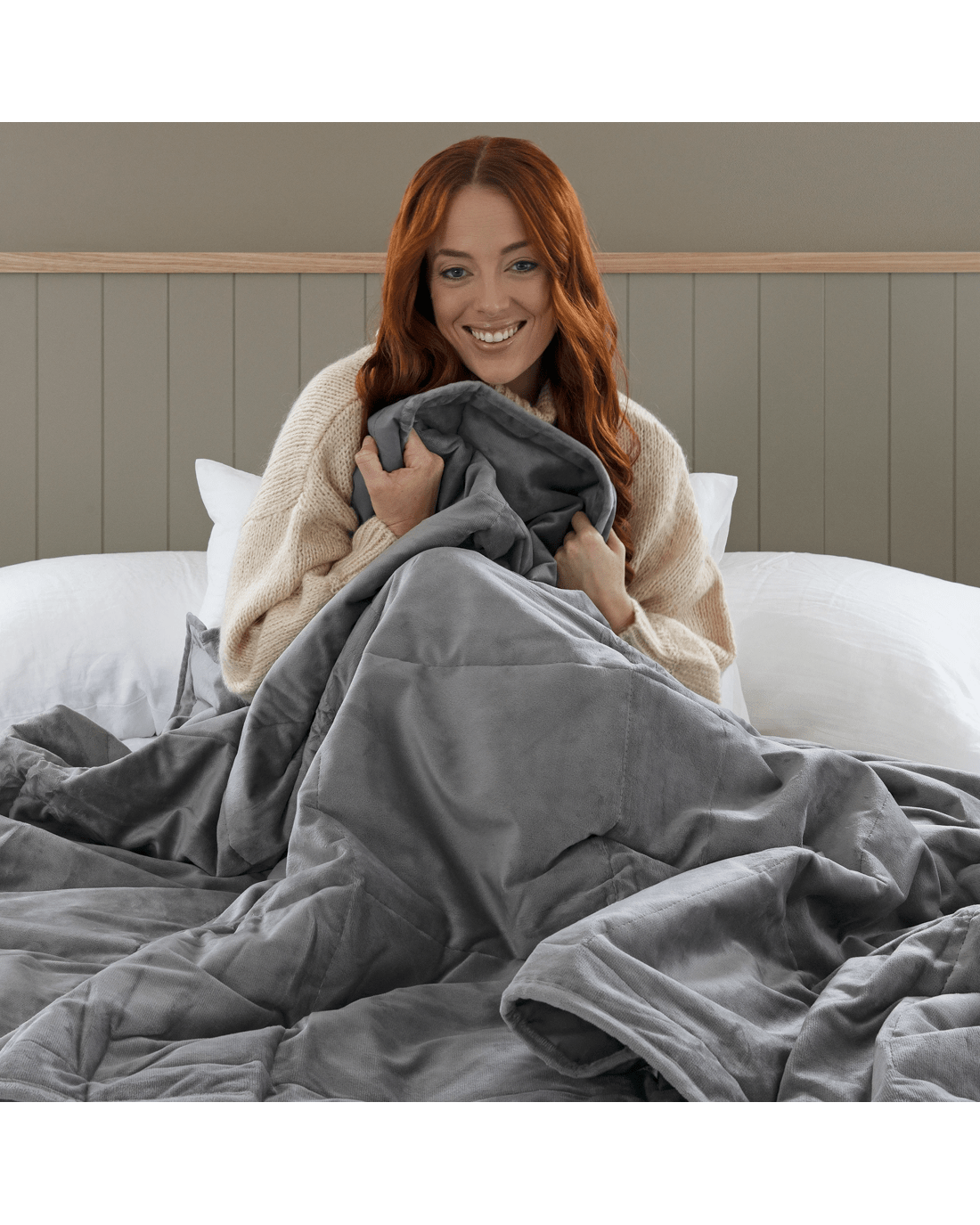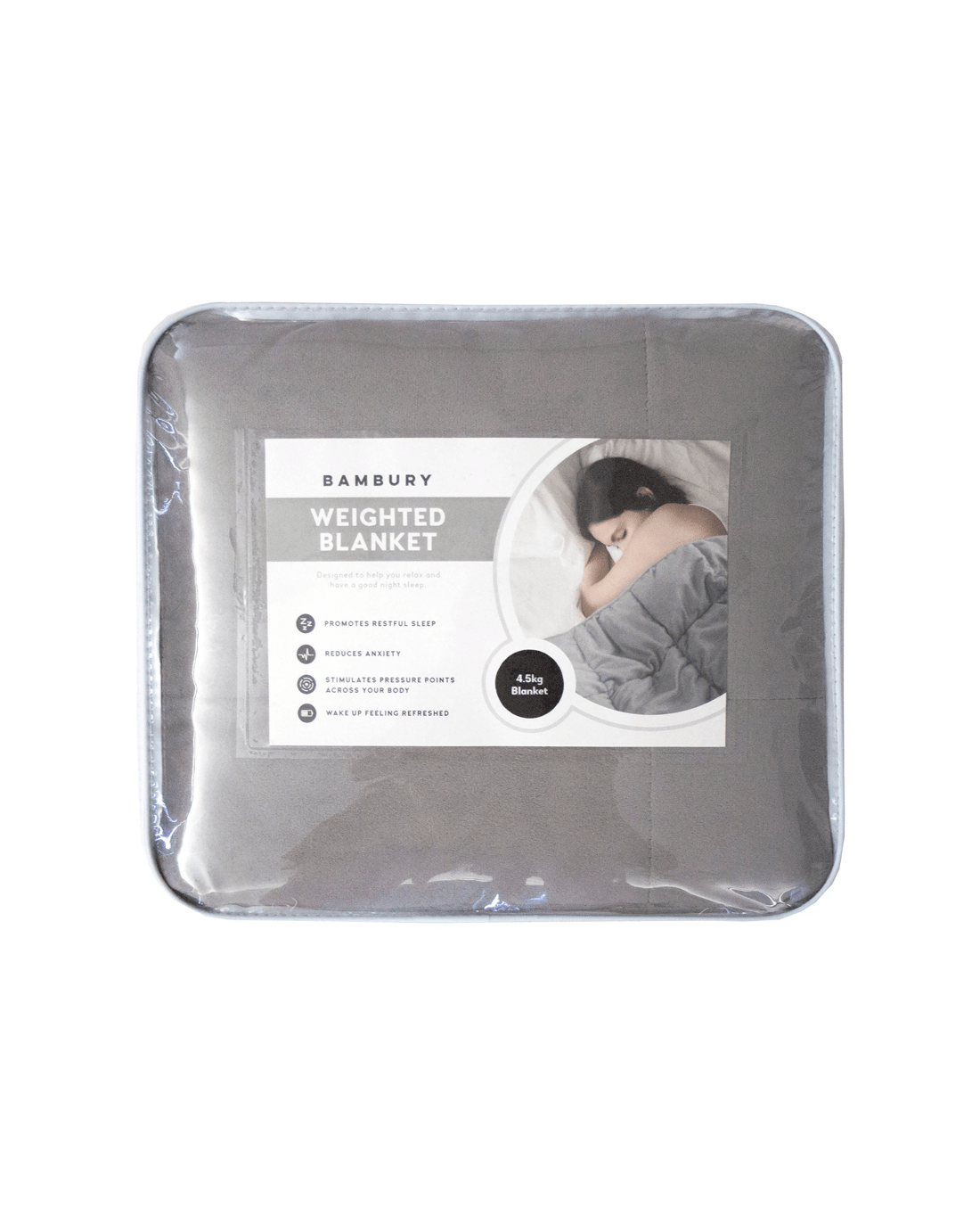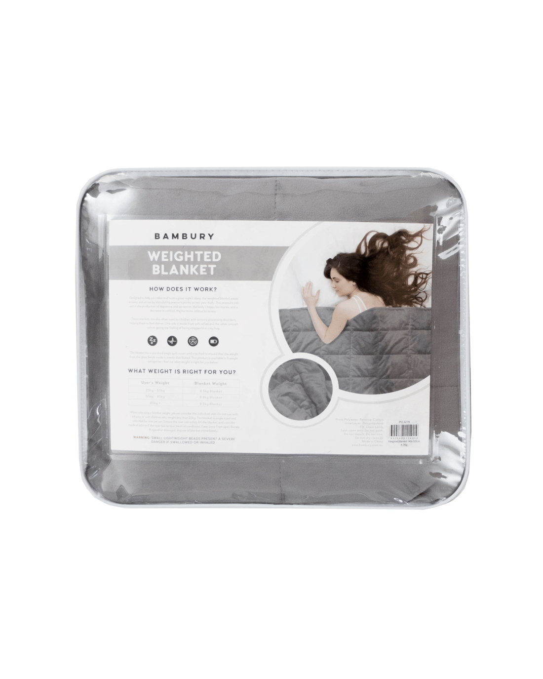 This blanket applies weight to your body's pressure points in order to help promote the production of sleep hormones. It is designed to feel like you are being wrapped in a big cosy hug, which can promote relaxation and help reduce anxiety - hopefully leading to a better, and calmer night's sleep! Weighted blankets have also been used by people with Sensory Perception or Autism Spectrum disorders. The blanket is significantly weighted, it is filled with glass beads, and because of this it is not machine washable, however our blanket can be covered with any single-sized quilt cover to help protect it from marks and spills. One side of this grey coloured blanket has a soft plush finish and the other side is a flat cotton weave fabric. There are three blanket weights that are available, and users must select a blanket weight according to the body weight of the user: 4.5kg (25-55kg), 6.8kg (55-85kg) and 9kg (>85kg). The blankets are designed for one person only and are not to be used by infants or small children, please refer to instructions carefully.