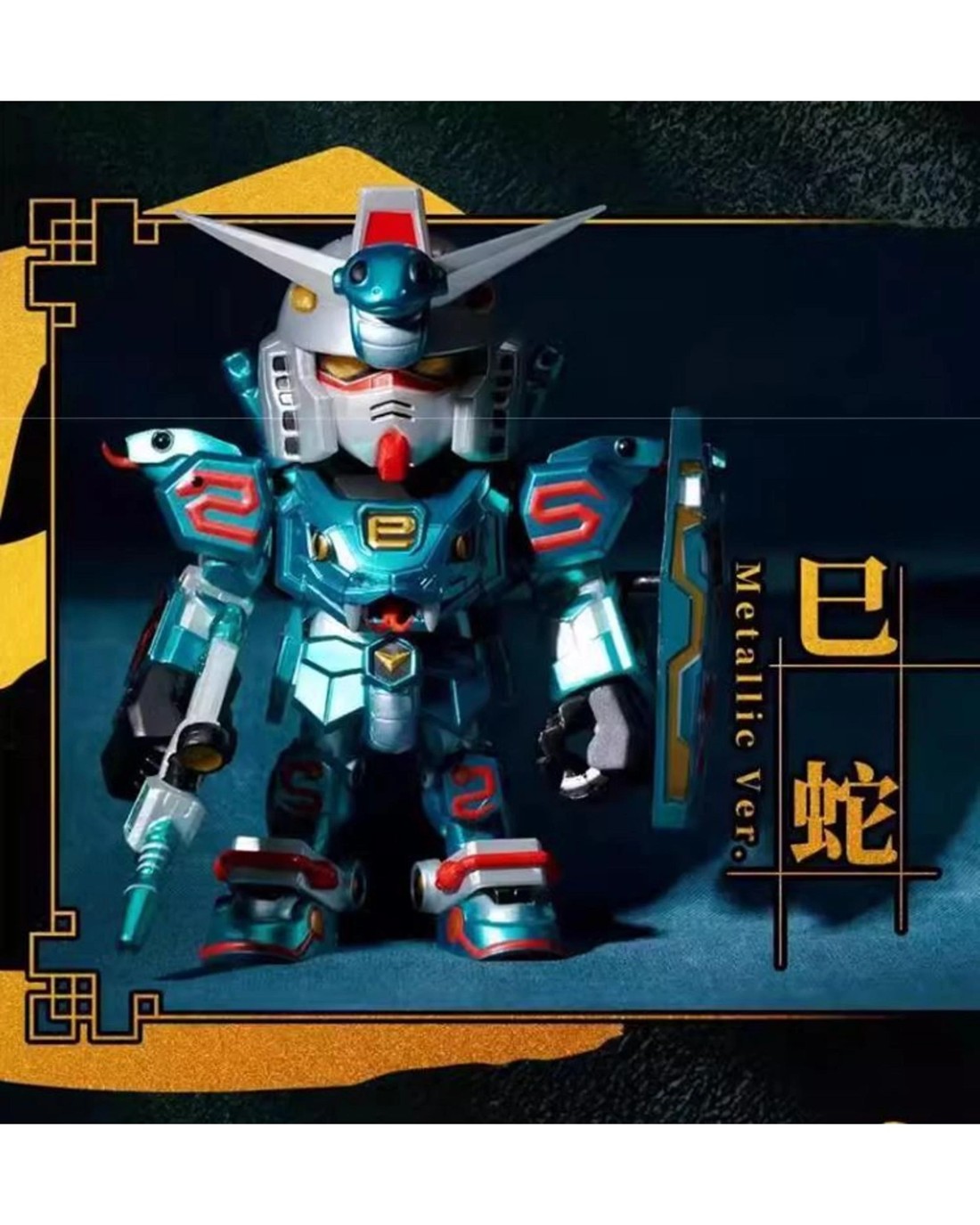 A collection of uniquely stylized action figures of originally designed Gundam, featuring Chinese Zodiac animals. Approximately 4" tall. For 2025 Year of the Snake, this sollection features many variations of the Snake, as well as some revious Zodiacs. There's 11 designs in total, with two secret desgins to find! Colelct them all!Contents