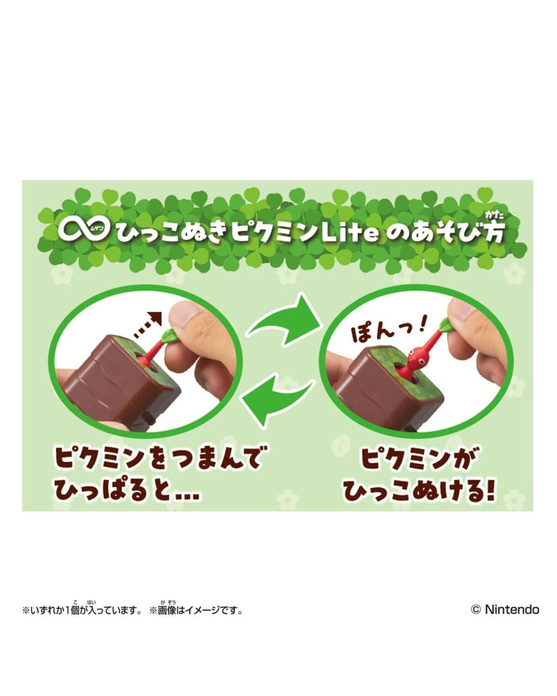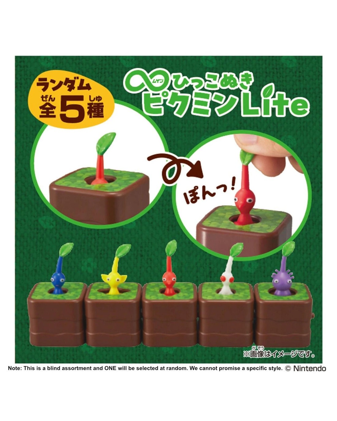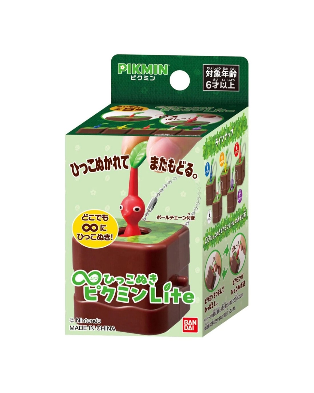 Introducing the “Infinite Pikmin”  line of fidget-type toys! These blind box items feature a Pikmin that can be plucked from its dirt block, then burrow back down on its own! Small in size each Pikmin comes with a ball chain, so you can attach it to your personal items and carry it around.  Each figure is randomly chosen from the lineup of Blue Pikmin, Yellow Pikmin, Red Pikmin, White Pikmin, Purple Pikmin, so you can enjoy revealing one of 5 different types of Pikmin! Grab the Pikmin to see which colour will pop through for you! Pluck over and over again, with no batteries required.  Ages 6 +