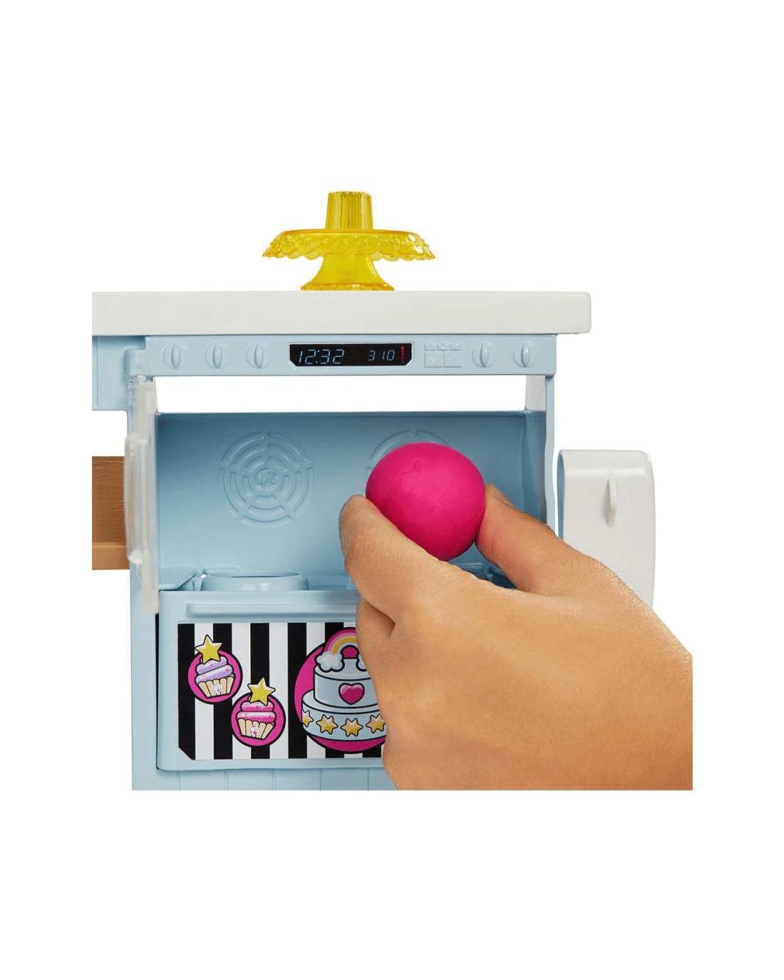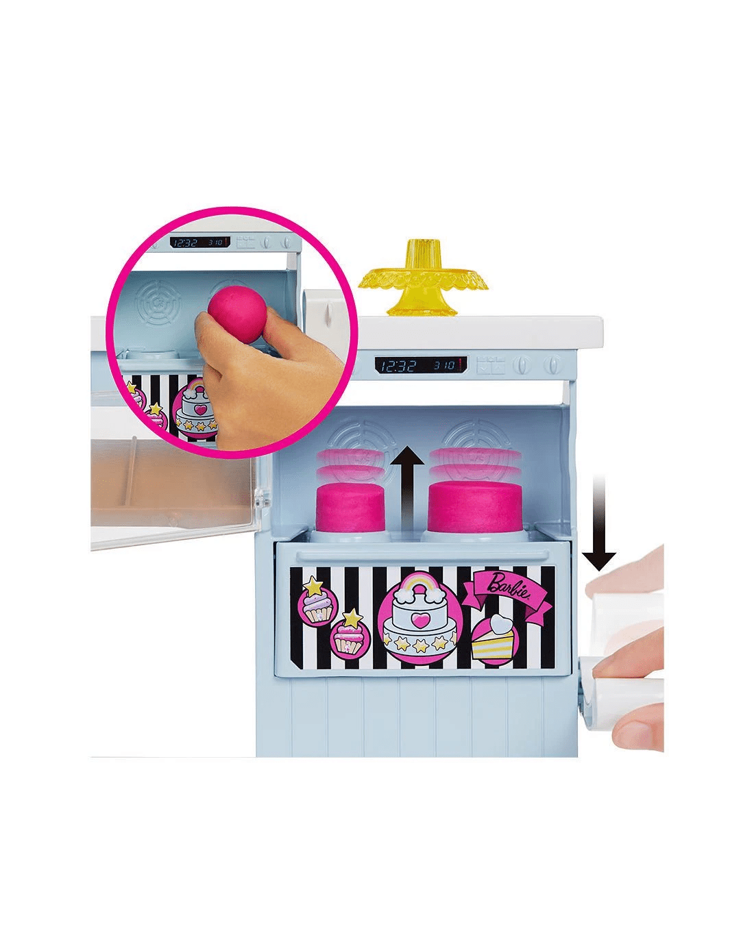 - To create realistic cake making, kids can use two kinds of dough (pink or blue) and put it in the oven, pull the lever and watch the cakes rise for cake-making fun!