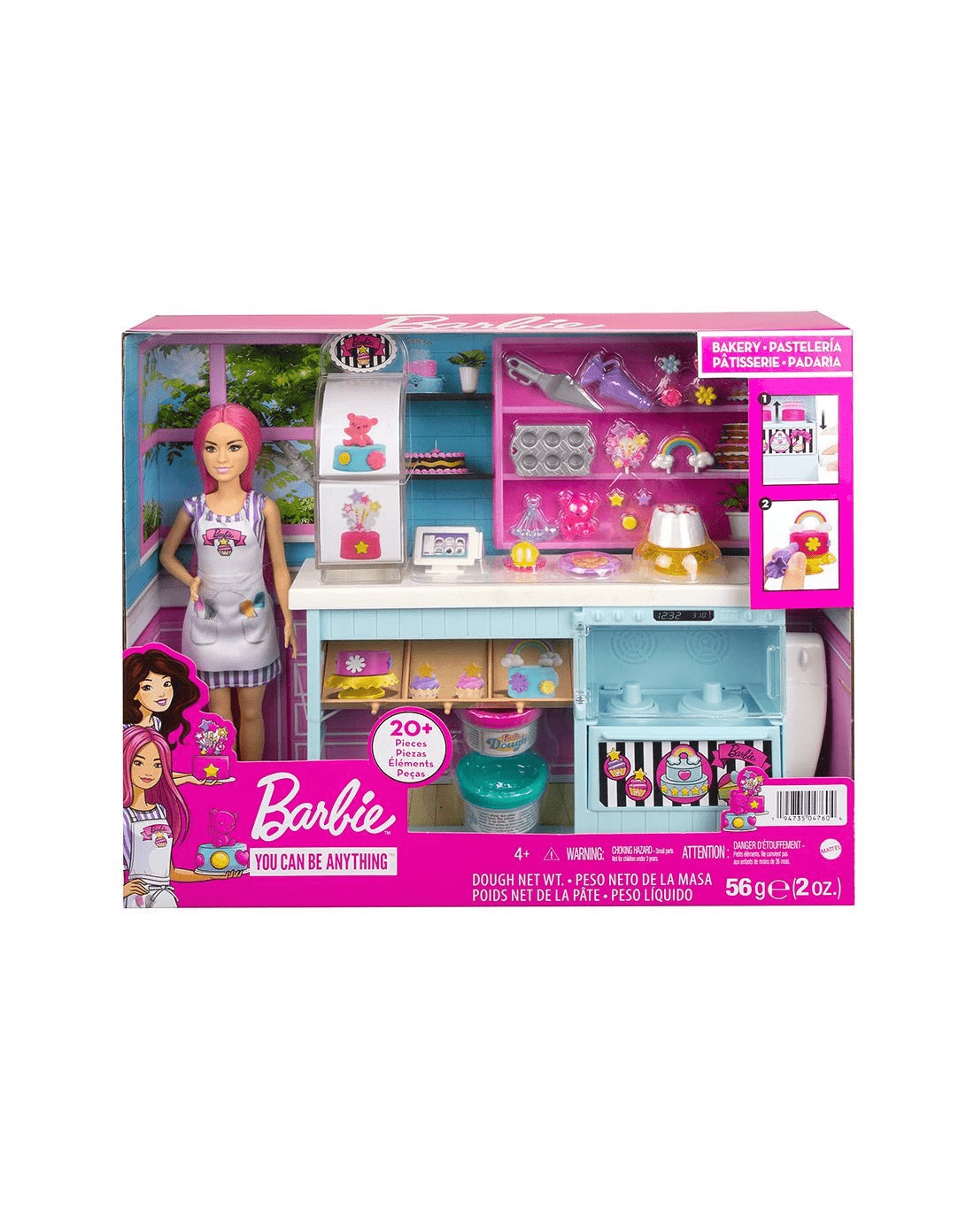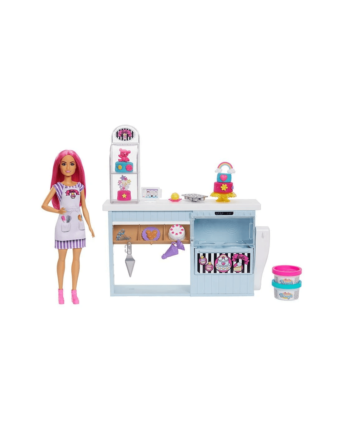 - Includes: Bakery station, Barbie 30cm petite doll with pink hair and 20+ pieces featuring 2 dough containers, piping bag stamper, spatula, decorations, toppers, cupcake tin, cookie plate and more