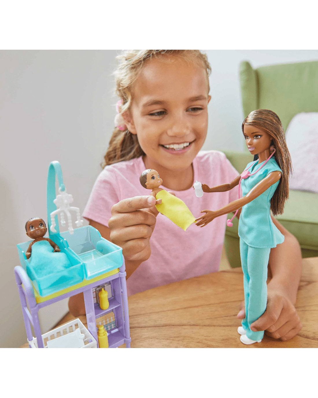 - Each set includes a doll, stylish piece of furniture and themed accessories for on-the-job training!