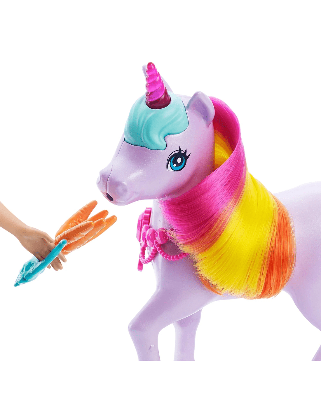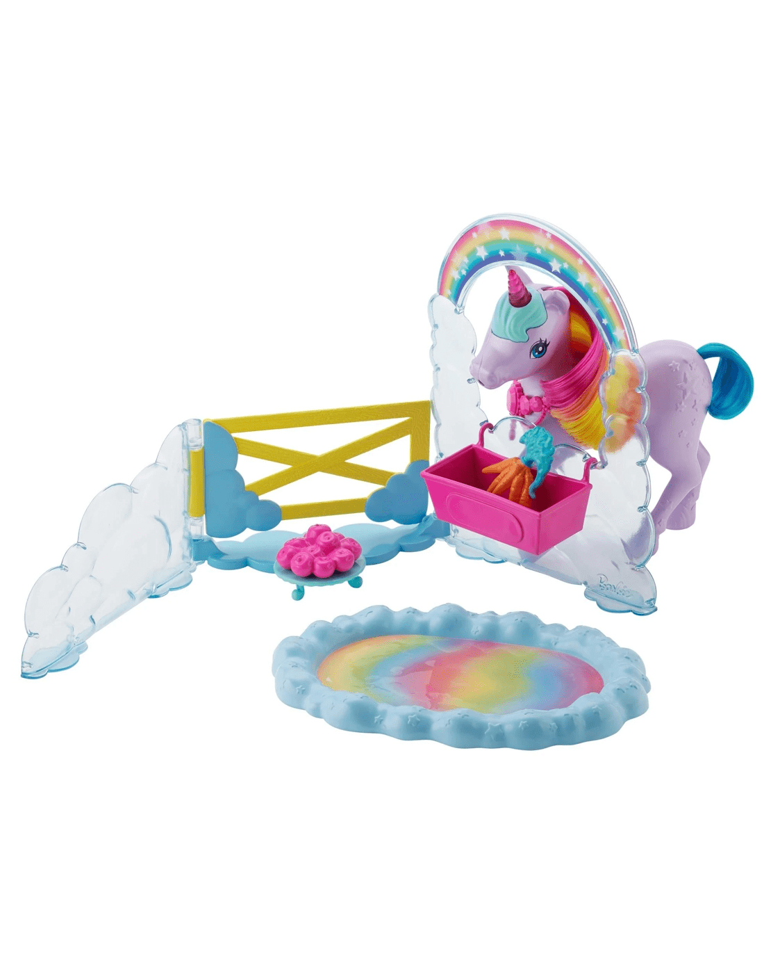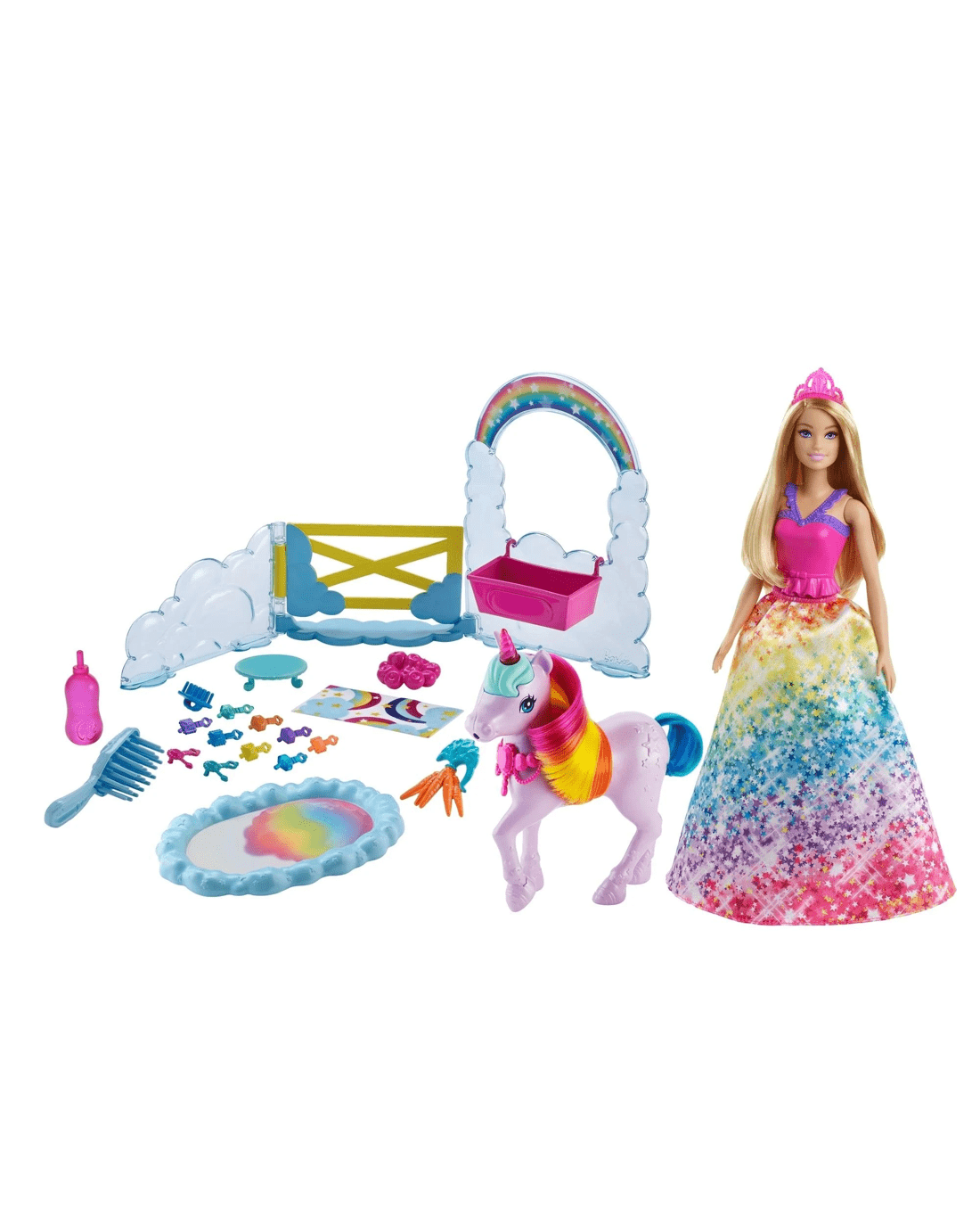 - Kids can play out feeding, grooming and styling fun as they help Barbie princess doll care for her magical unicorn in its cloud-inspired stable.