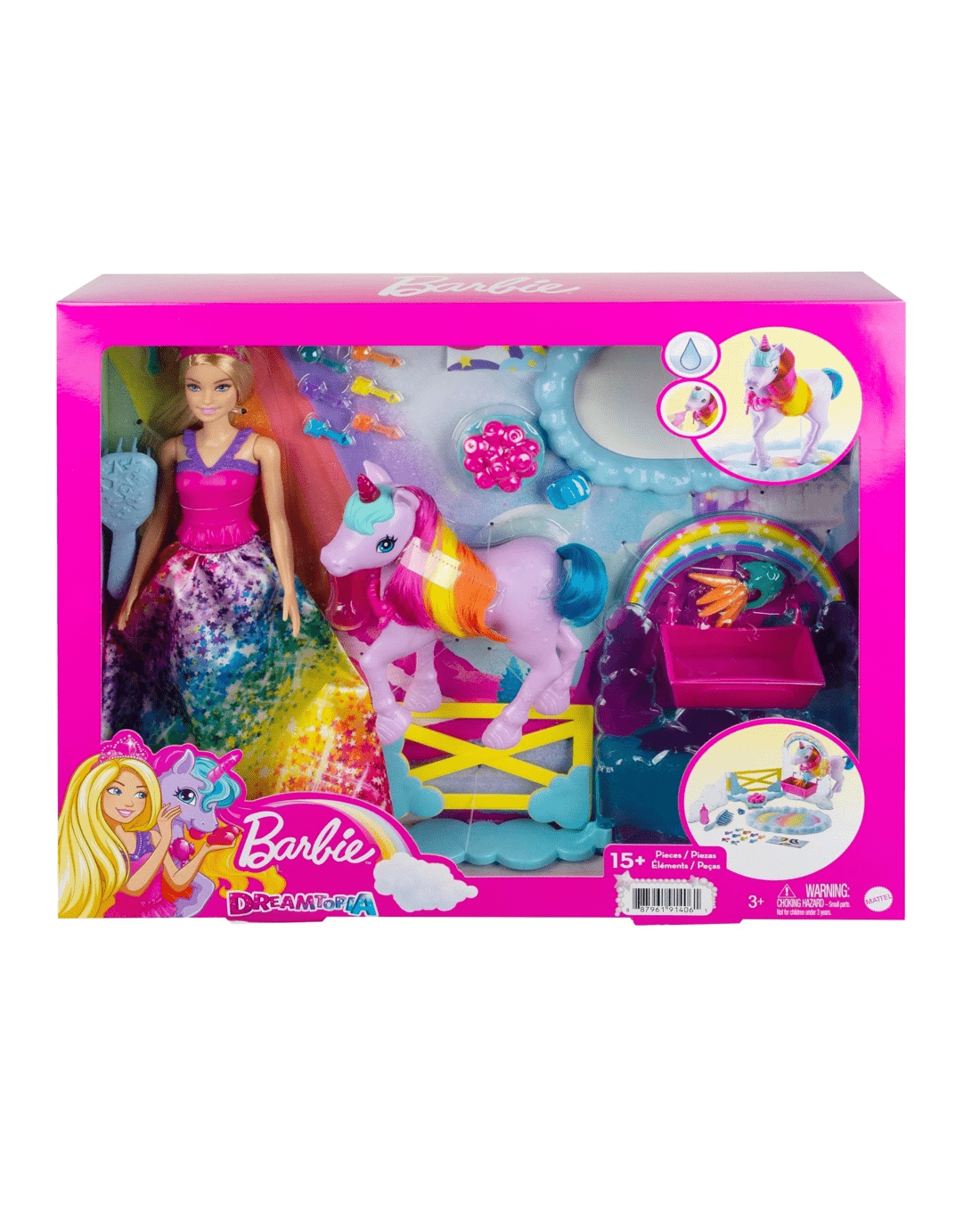 - Nurturing play meets fairytale storytelling with this Barbie Dreamtopia playset featuring Barbie princess doll, her pet unicorn and a magical colour change feature!