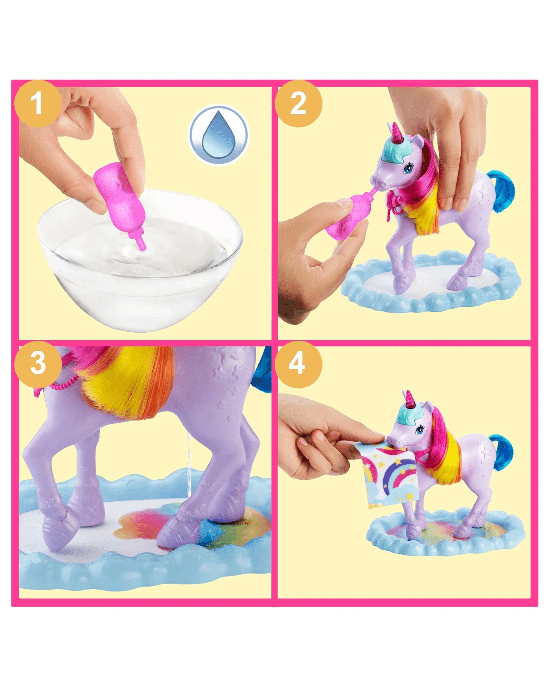 Step into a whimsical world of imagination with the Barbie Dreamtopia Doll and Unicorn set. Watch your children's faces light up as they care for Barbie's adorable unicorn in a magical stable inspired by dreamy clouds and rainbows. The fun comes alive with a magical colour-changing potty pad—simply fill the bottle, feed the unicorn, and see the pad transform from white to a whirlwind of rainbow colours, ready for little ones to repeat the fun again and again. With charming accessories for feeding, grooming, and styling Barbie and her unicorn's flowing mane, this enchanting playset offers endless opportunities for storytelling and creative adventures. Let your child's dreams take flight—bring home this delightful set and let the magic begin.
