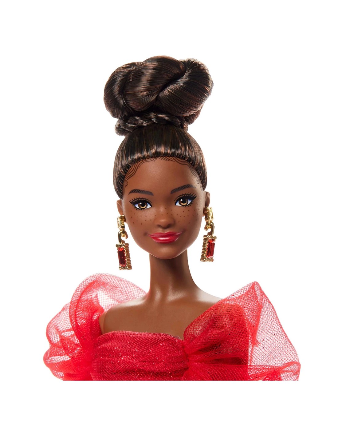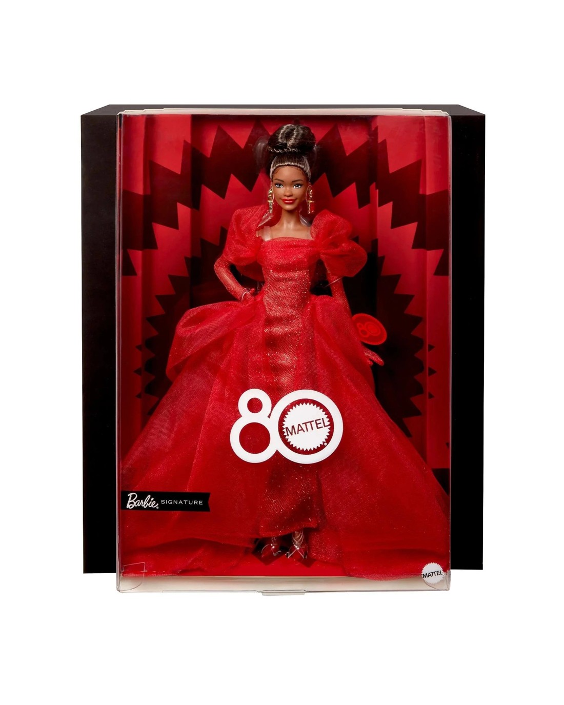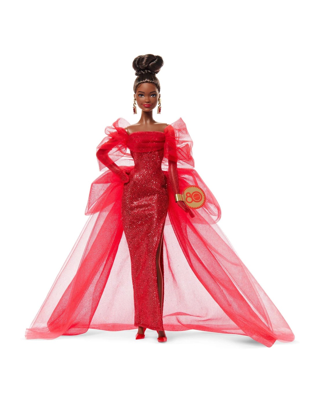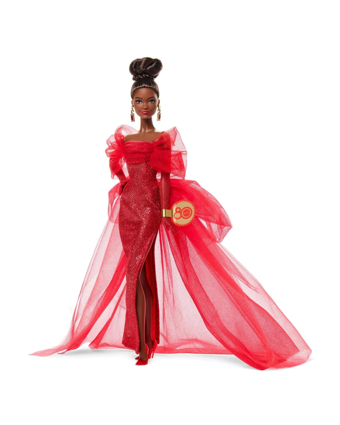 Eight decades of iconic toymaking warrants a special design to mark the occasion. Behold our Mattel 80th Anniversary Barbie doll, a stunning keepsake that honours the legacy of a company that has inspired generations. She looks red carpet-ready in a glittery gown accentuated by bow-like sleeves and a dramatic tulle bustle. Ruby pumps complement her dazzling look, while red nails and drop earrings with a golden “M” pay stylish homage to the old-school Matty Mattel logo. Doll cannot stand alone. Doll stand included. Colours and decorations may vary. Ages 6 +
