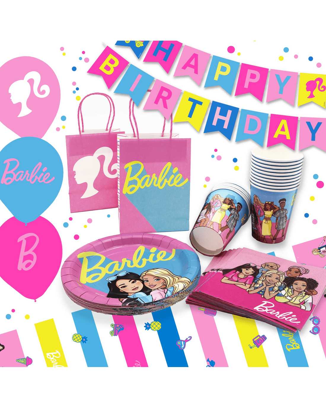 - Includes 32 x Barbie napkins, 16 x Barbie paper cups, 16 x Barbie paper plates, 1 x Barbie banner, 1 x Barbie tablecover, 6 x Barbie latex balloons and 16 x Barbie kraft party bags