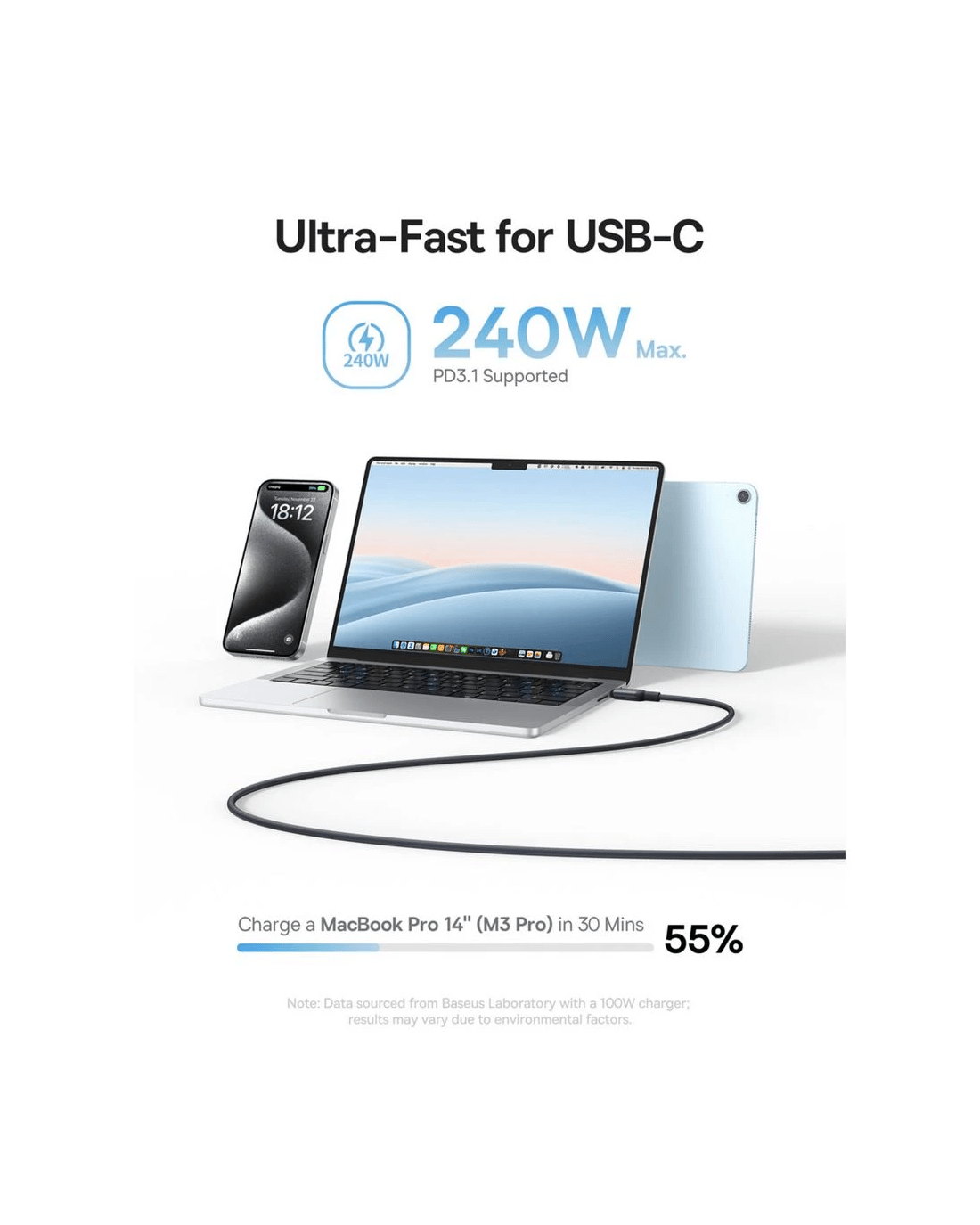 - This cable supports up to 240W charging for high-powered USB-C devices.