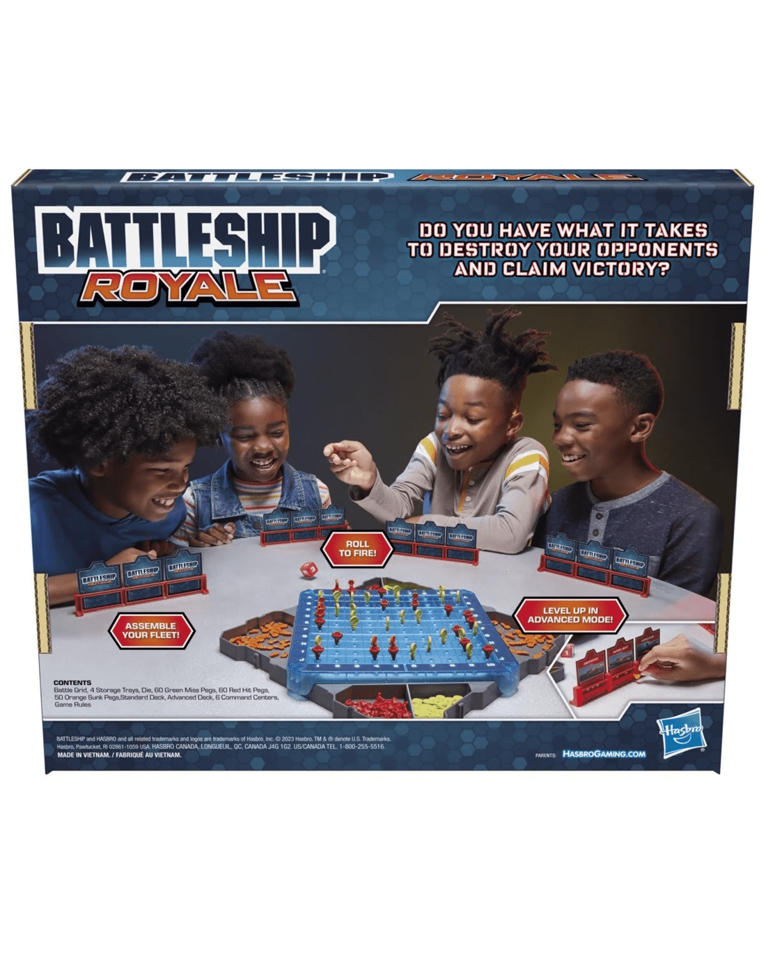 Many will sink. One will survive. Face off with up to 6 players and compete to be the last afloat in the Battleship Royale game! In this exciting party game take on the beloved Battleship search-and-find game, all players share one Battle Grid to mark hits and misses. Instead of placing physical ships, they're dealt Ship cards that reveal their fleet and where their ships live on the grid. The cards slip into handheld Command, so players can secretly track hits. Roll the die to fire to fire on opponents. The last one with a ship left on the grid wins! Ready to level up? Play in Advanced Mode and create an elite fleet with the addition of submarines, which can share coordinates with ships and have ship-detecting Sonar capabilities! The Battleship Royale gameboard stores easily and has built-in trays for pegs. It's a thrilling game for Family Game Night and makes a fun gift for kids aged eight and up!