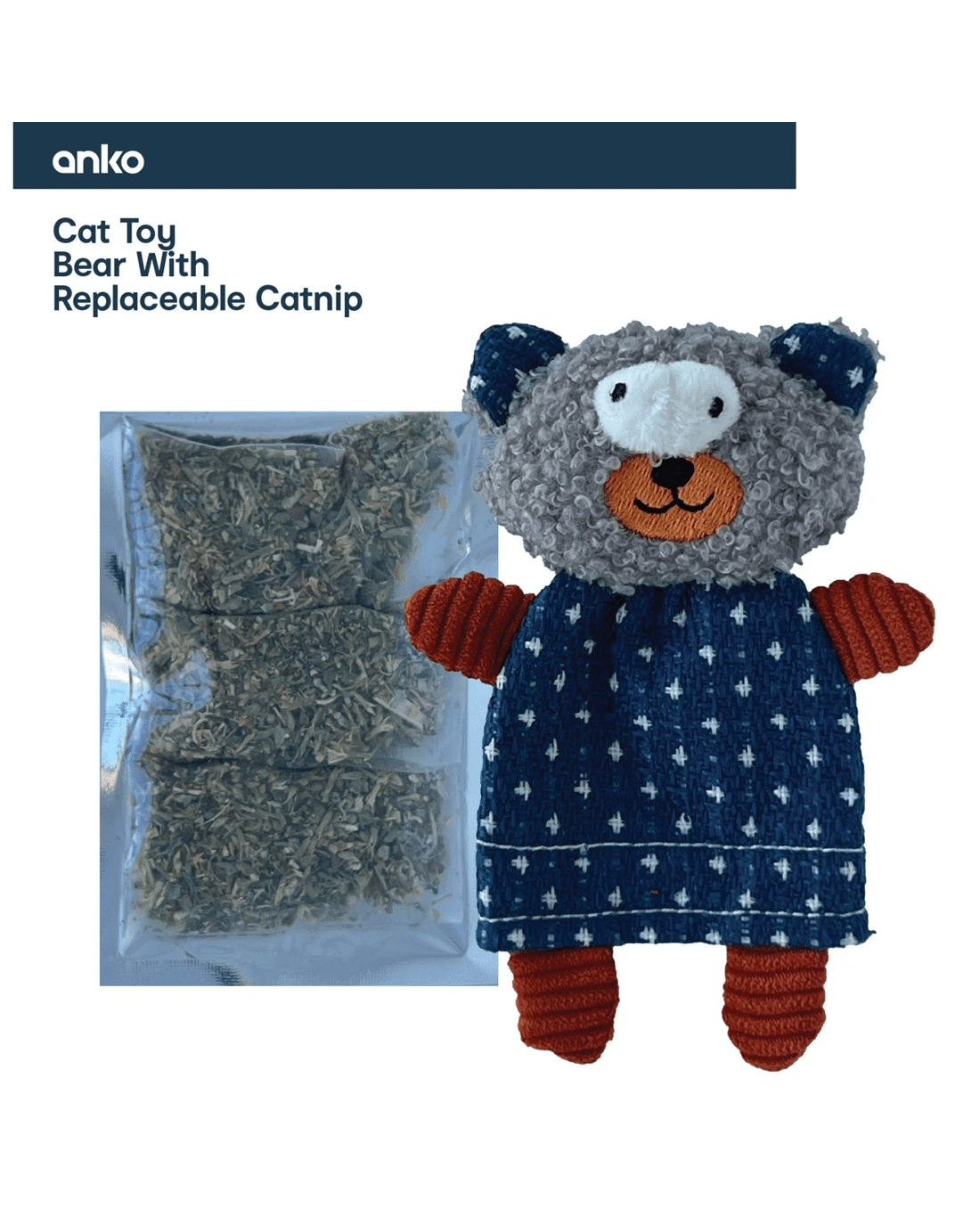Delight your feline friend with this charming blue polka-dot bear toy. Designed with a playful pattern, it includes three replaceable catnip pouches to maintain your feline's interest.