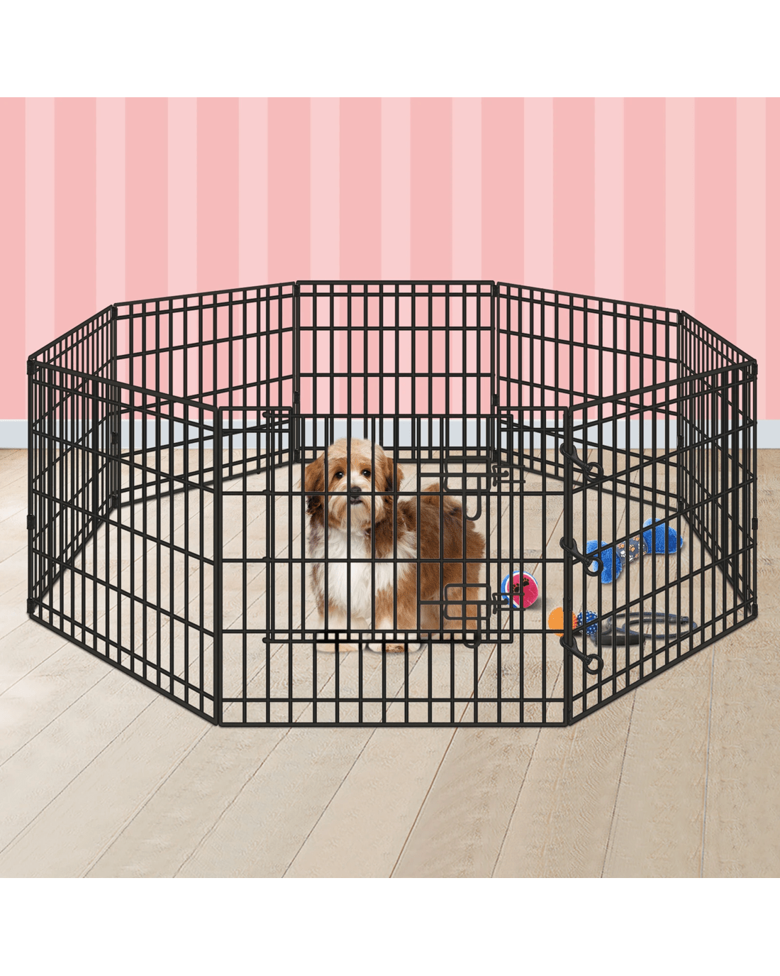 Created for both relaxing and housetraining, this heavy-duty fence boasts sturdy metal construction and rust-resistant powder coating to make it last longer.