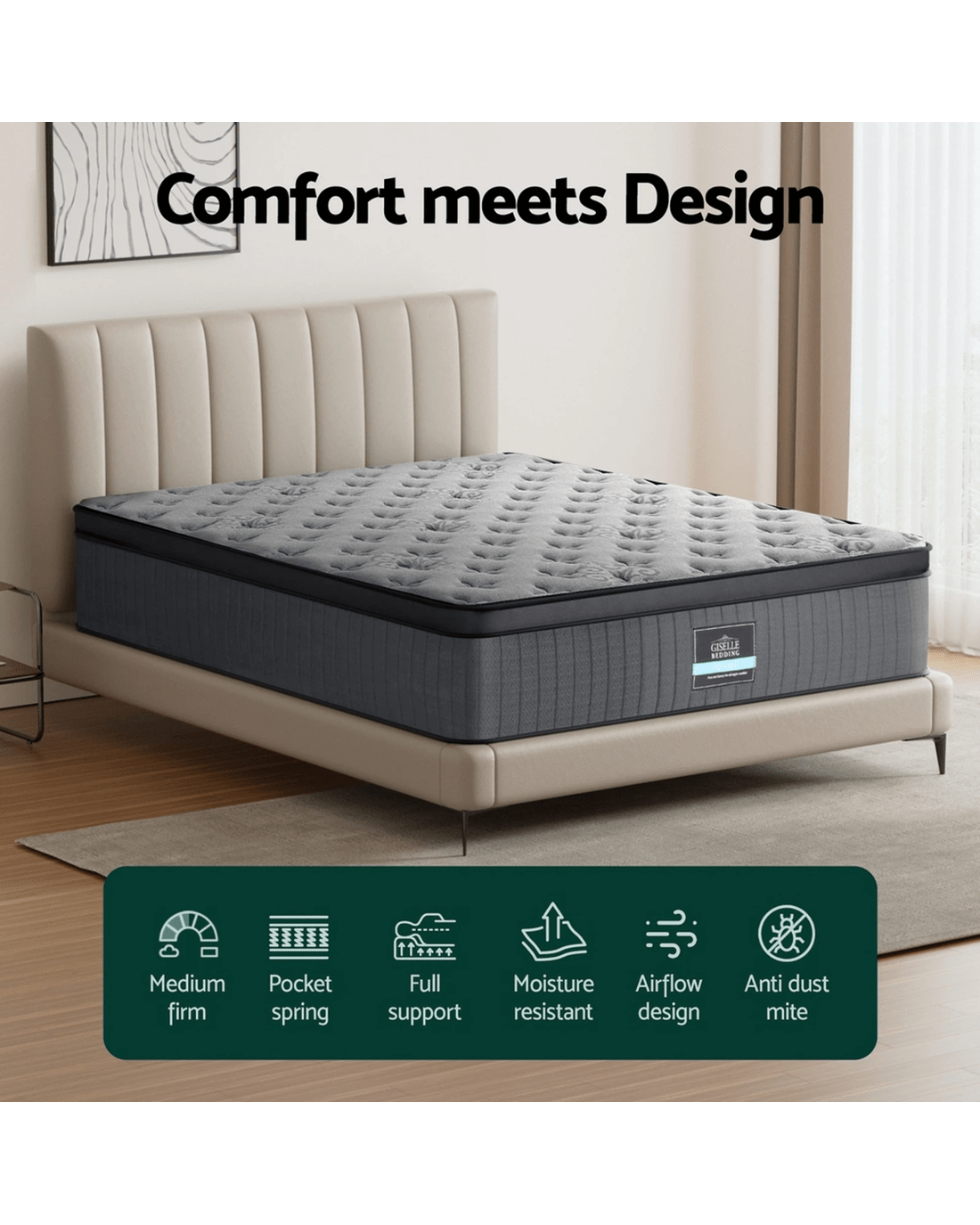 The Giselle Bedding Euro Top Mattress from the Solene Series delivers a restful sleep experience with its 34cm thickness. Featuring a Euro Top design, this mattress offers a plush, yet supportive surface with medium-firm support to ensure proper spinal alignment. The 300g knitted fabric cover enhances breathability, keeping you cool throughout the night. The mattress is equipped with 5 zoned pocket springs and an independent coil system, which reduces motion transfer for a peaceful, undisturbed sleep.