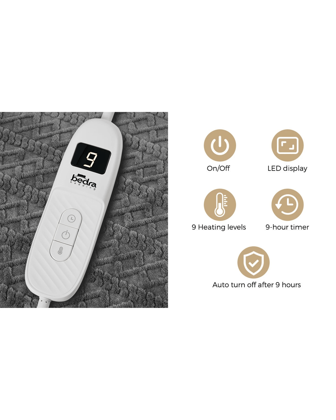 Better still, the handy digital controller lets you adjust the desired temperature at your fingertips with a selection of nine heating levels, conveniently indicated on the LED display, to suit your preference. You can also set the heat to come on at the designated time and let it run for up to nine hours with an automatic shut-down should you forget to turn it off.