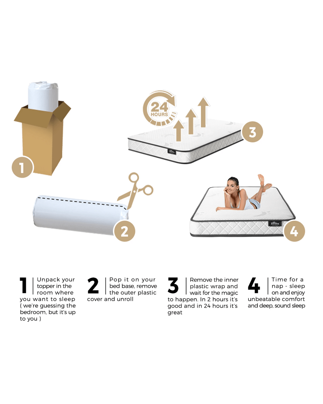 1. The mattress comes in a vacuum-packed packaging and requires 24 hours to fully expand to its desired shape.