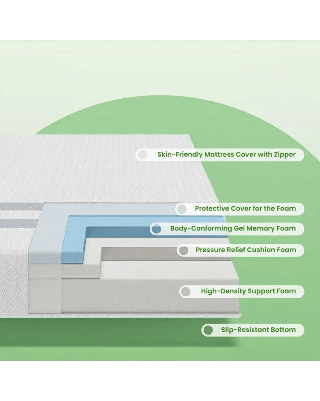 The gel-infused memory foam layer helps regulate temperature, keeping you cool throughout the night, while the high-density support foam enhances durability and airflow for a fresh, restful sleep.