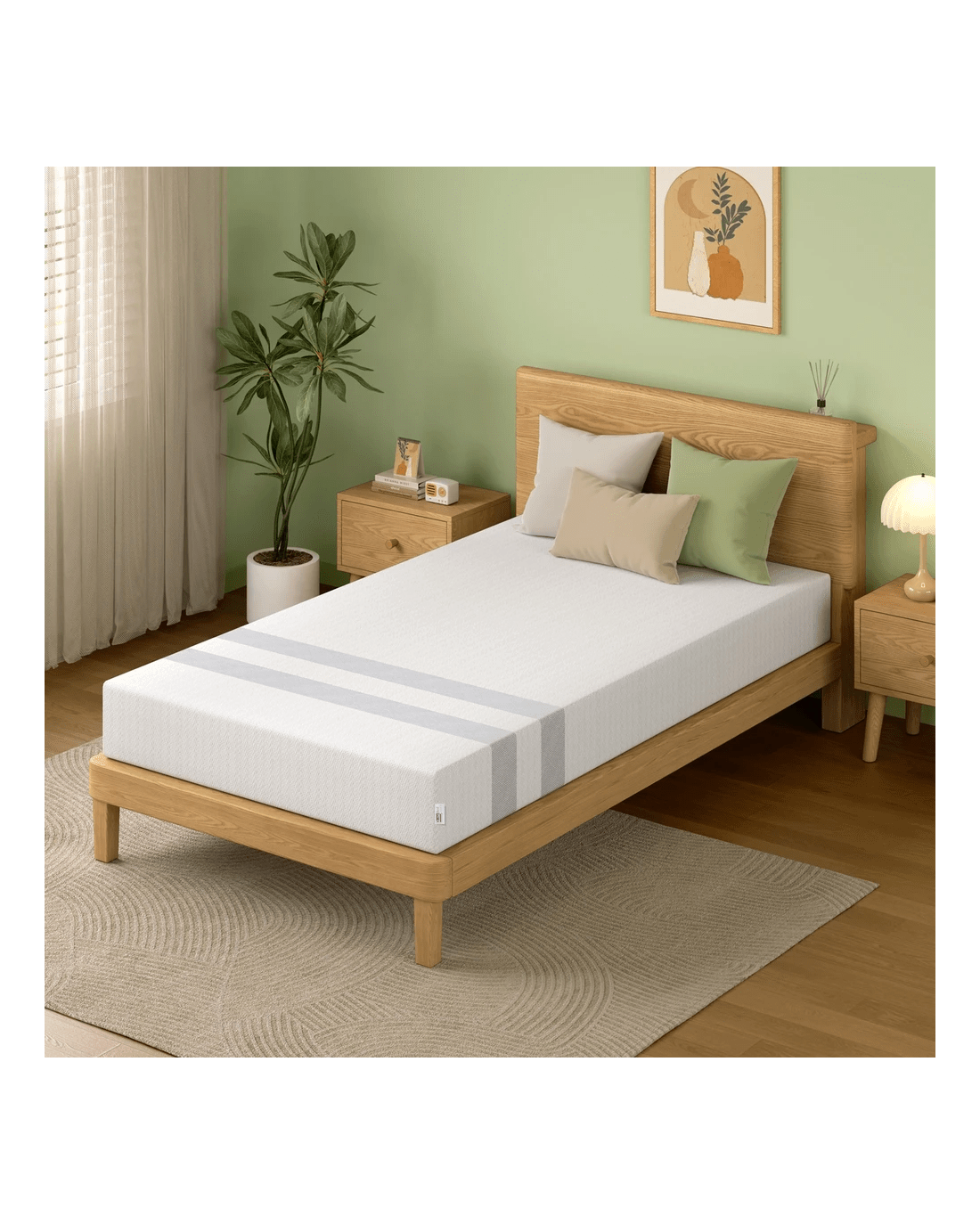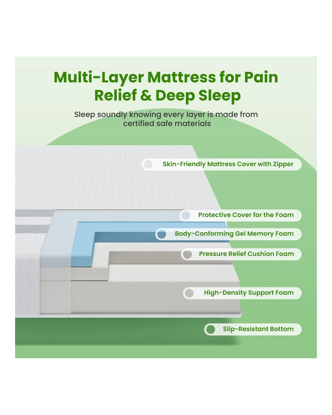 The gel-infused memory foam layer helps regulate temperature, keeping you cool throughout the night, while the high-density support foam enhances durability and airflow for a fresh, restful sleep.