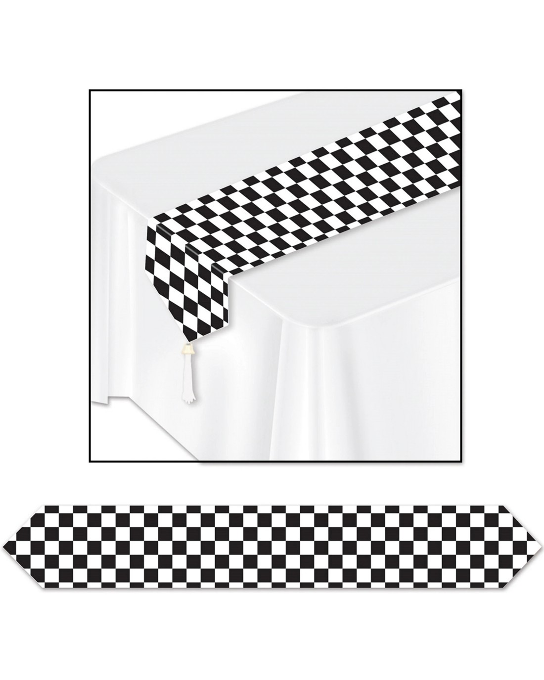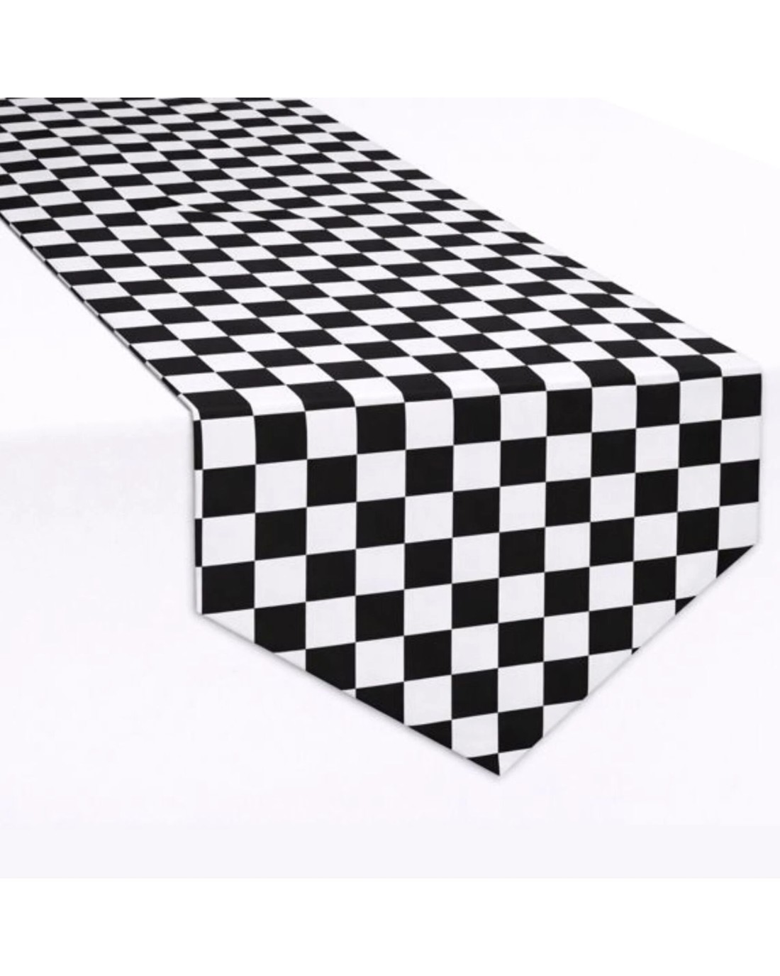 Featuring a classic black and white checkered pattern use this runner to decorate your table at your racing or Cars themed event.