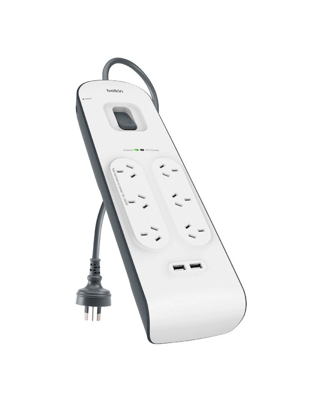 This Belkin 6 Outlet Powerboard with 2 USB Ports allows you to instantly add 6 AC outlets and USB charging capability to your wall socket. It provides 6 AC outlets with surge protection while also providing 2 USB ports for charging your smartphones, tablets, GPS and other USB devices.
