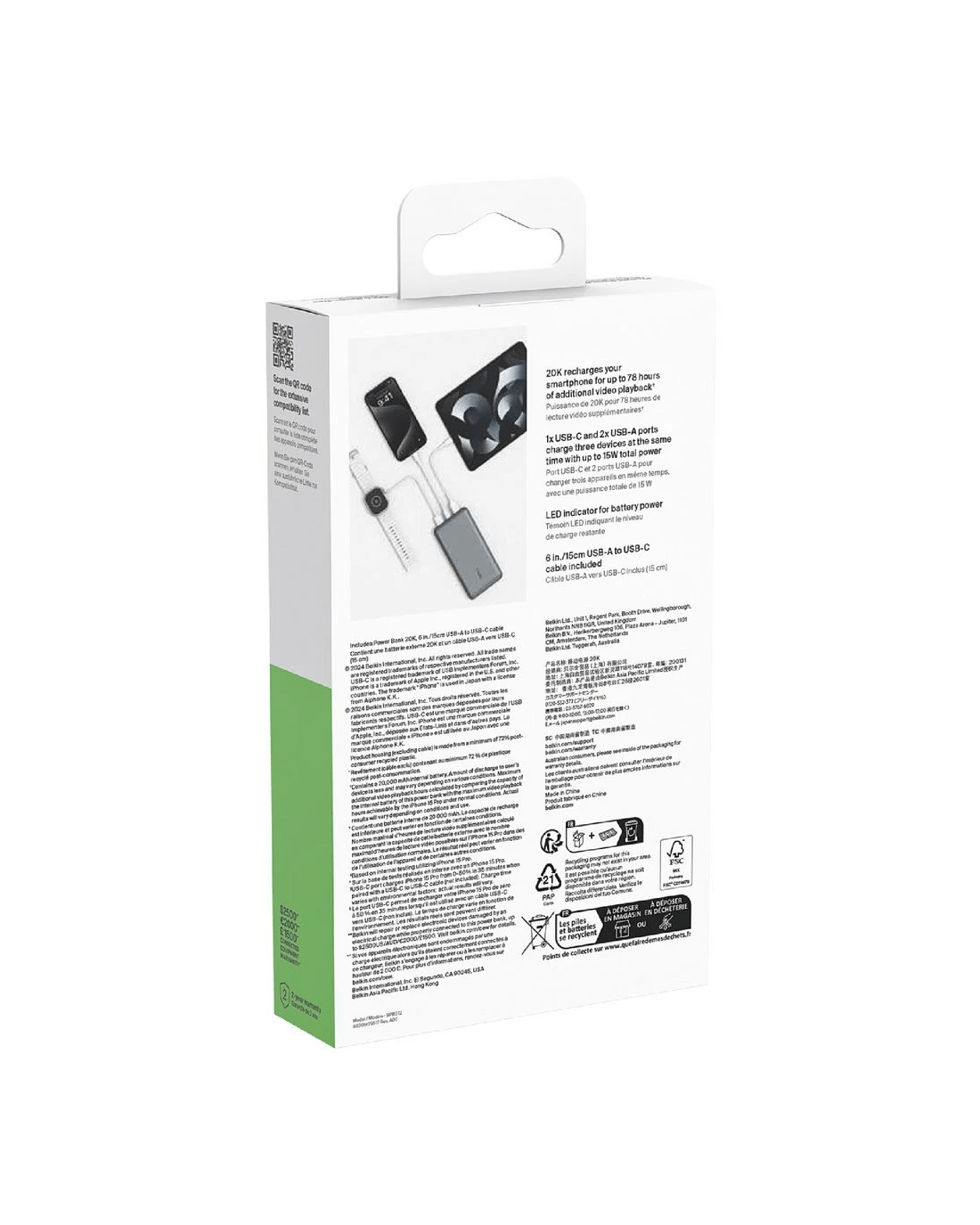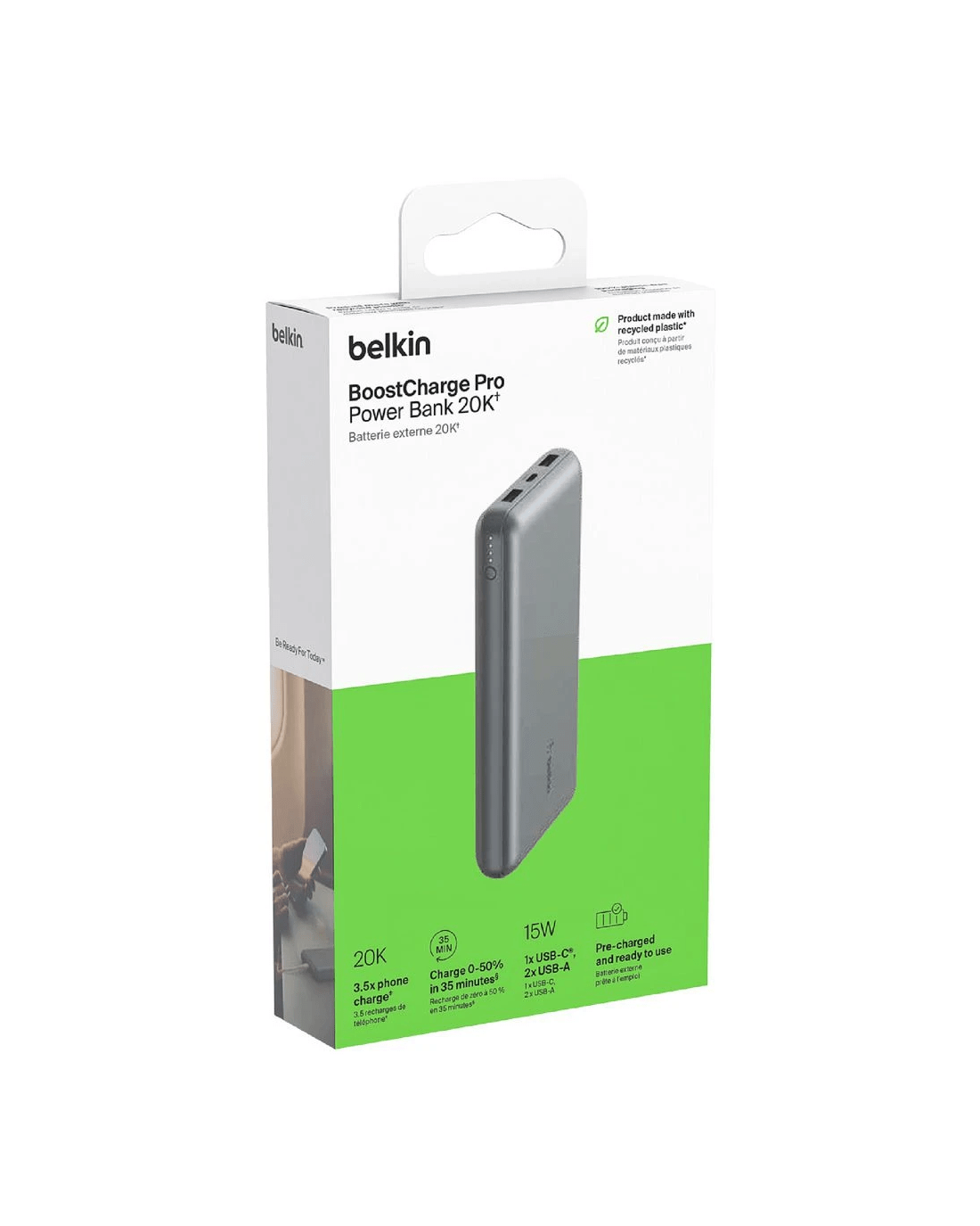 Stay charged anywhere with the Belkin Boost 20K Power Bank. You can charge up to 3 devices at the same time through its USB-C port and dual USB-A ports. Plus, the 20,000mAh battery can provide enough power to recharge your smartphone for up to 75 additional hours.