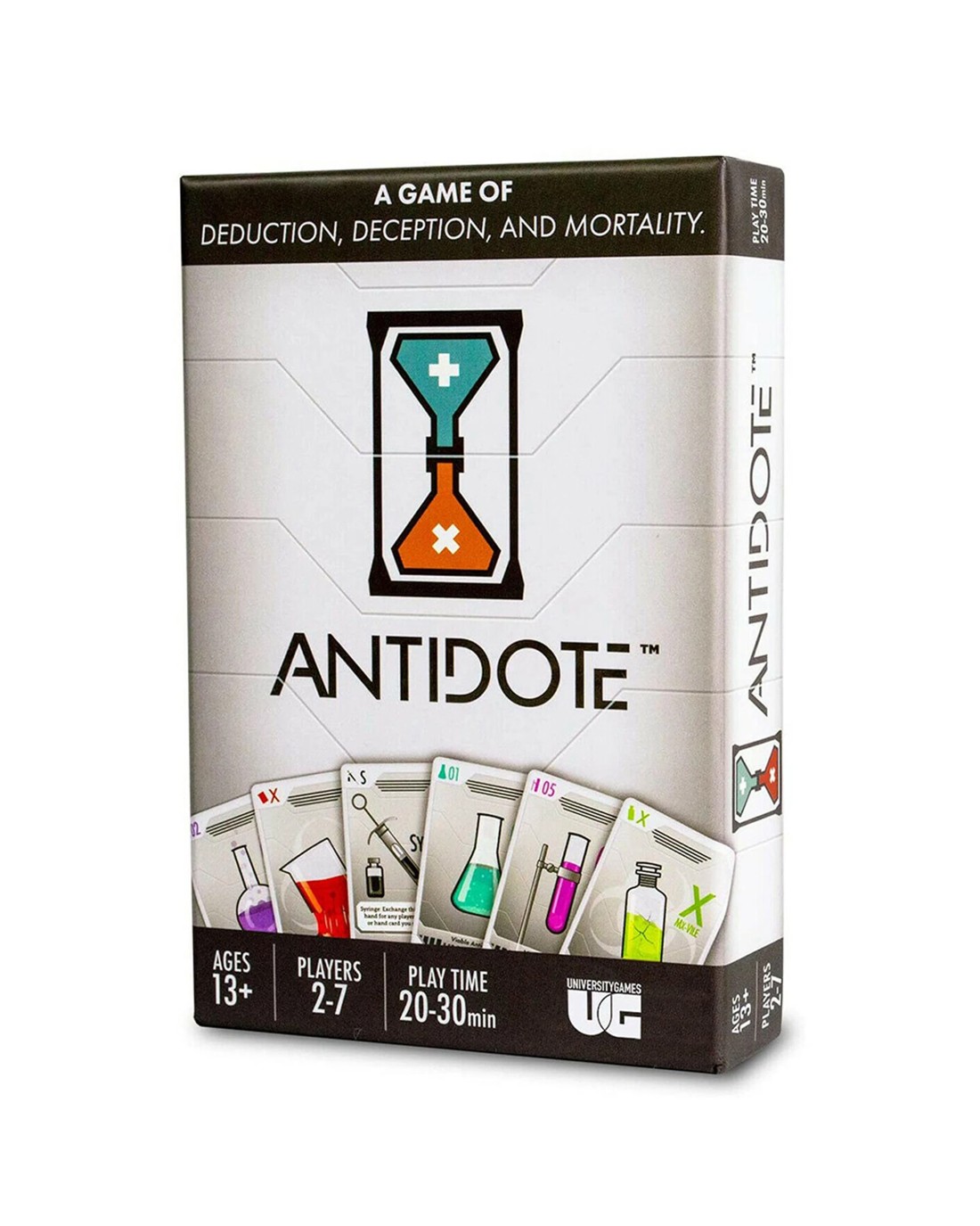 In Antidote, you are a laboratory scientist working for a giant chemical research conglomerate. When you and your lab are suddenly exposed to a deadly toxin, you must work quickly to share your research and discover the Antidote before it's too late! In the game, players take turns deciding what action all other players take: either discard from their hand or trade research with other players. Eventually all your cards will run-out and you will be left with just one that you must “drink” and hope its the Antidote. If this card is the true Antidote, you're cured and live! If not…you die, but you can always try again! Ages: 13 + | Players: 2 - 7 | Playtime: 20-30 min