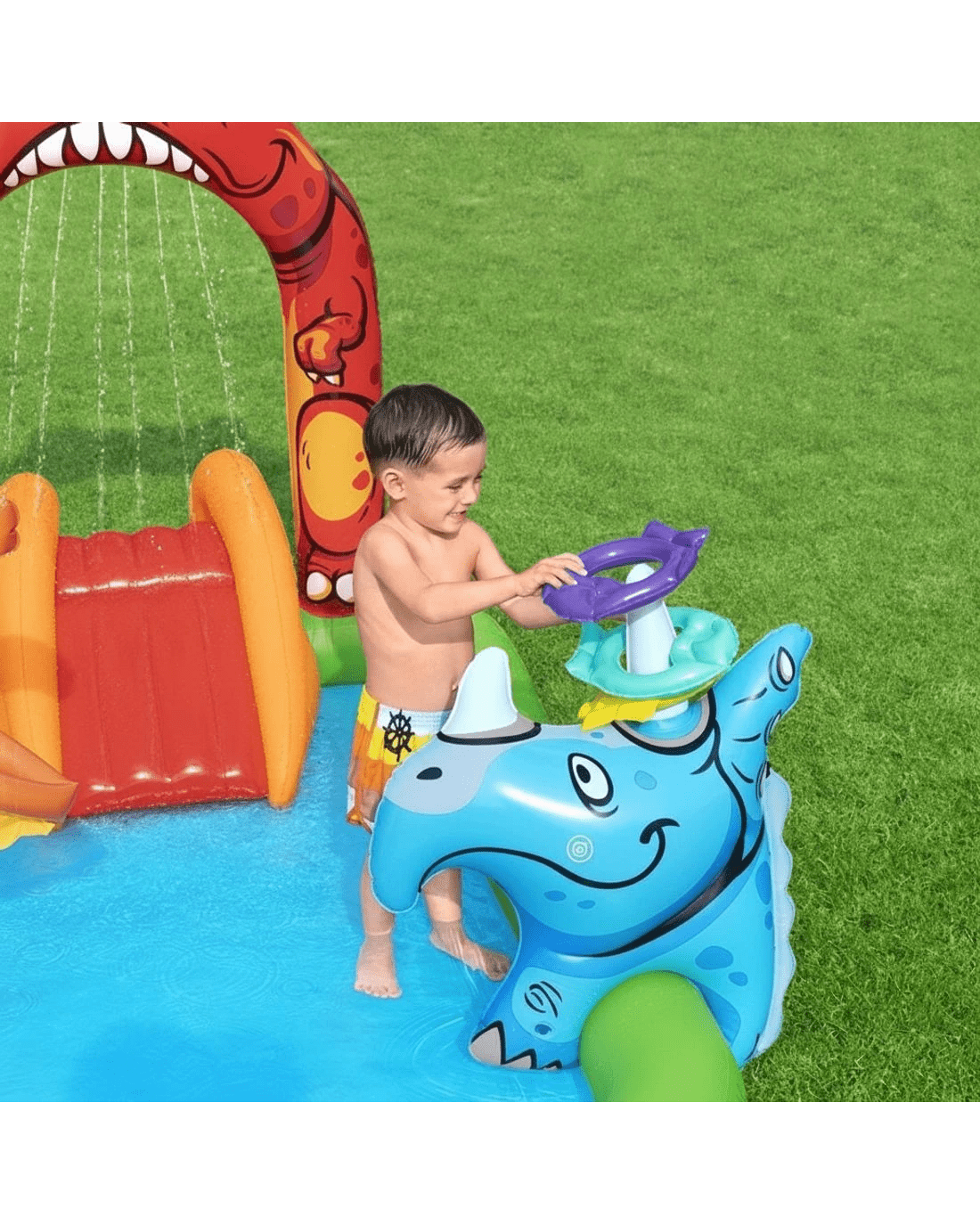 Under the sea! Let your kids and friends have a splashing great time with the Bestway Fantastic Jurassic Pool. Featuring a wonderful play area with an dinosaur theme, the Pool has a fun slide and plenty of interactive play with a triceratops ring toss game with two inflatable fish-shaped rings. Attach the garden hose to the water sprayer and your kids will have an even more wet and wild time in this ensemble. Everything is made child-safe with the sturdy pre-tested vinyl. Filling and draining is easy with the drain valve attached to any garden hose and a repair patch is included.
