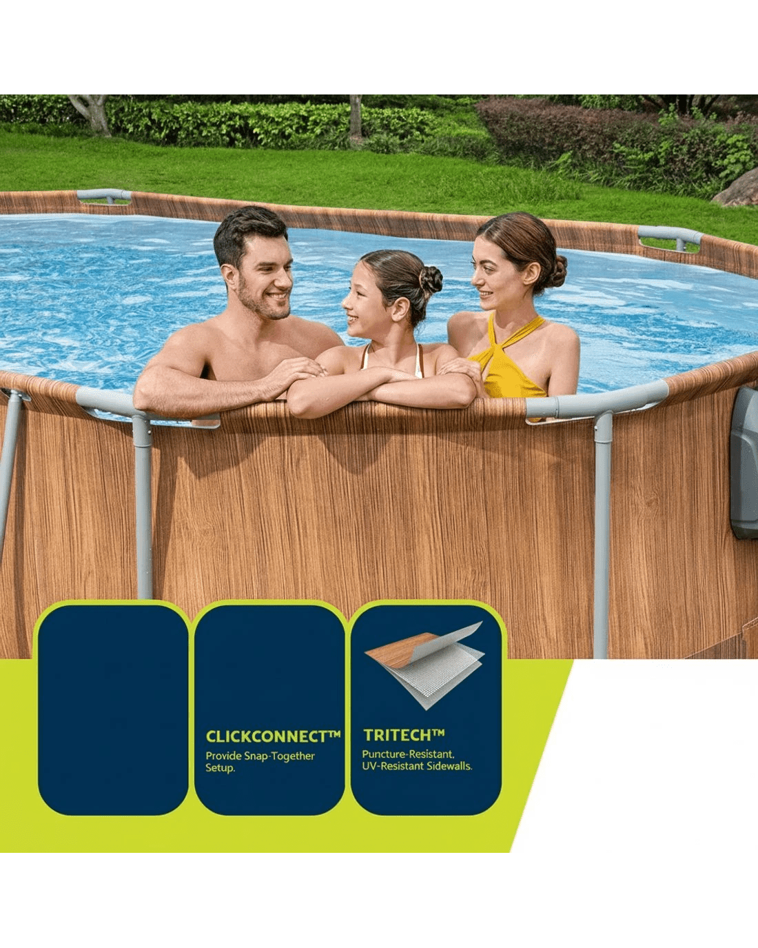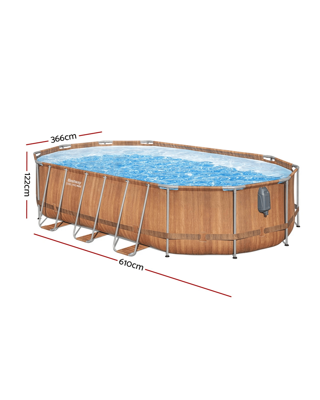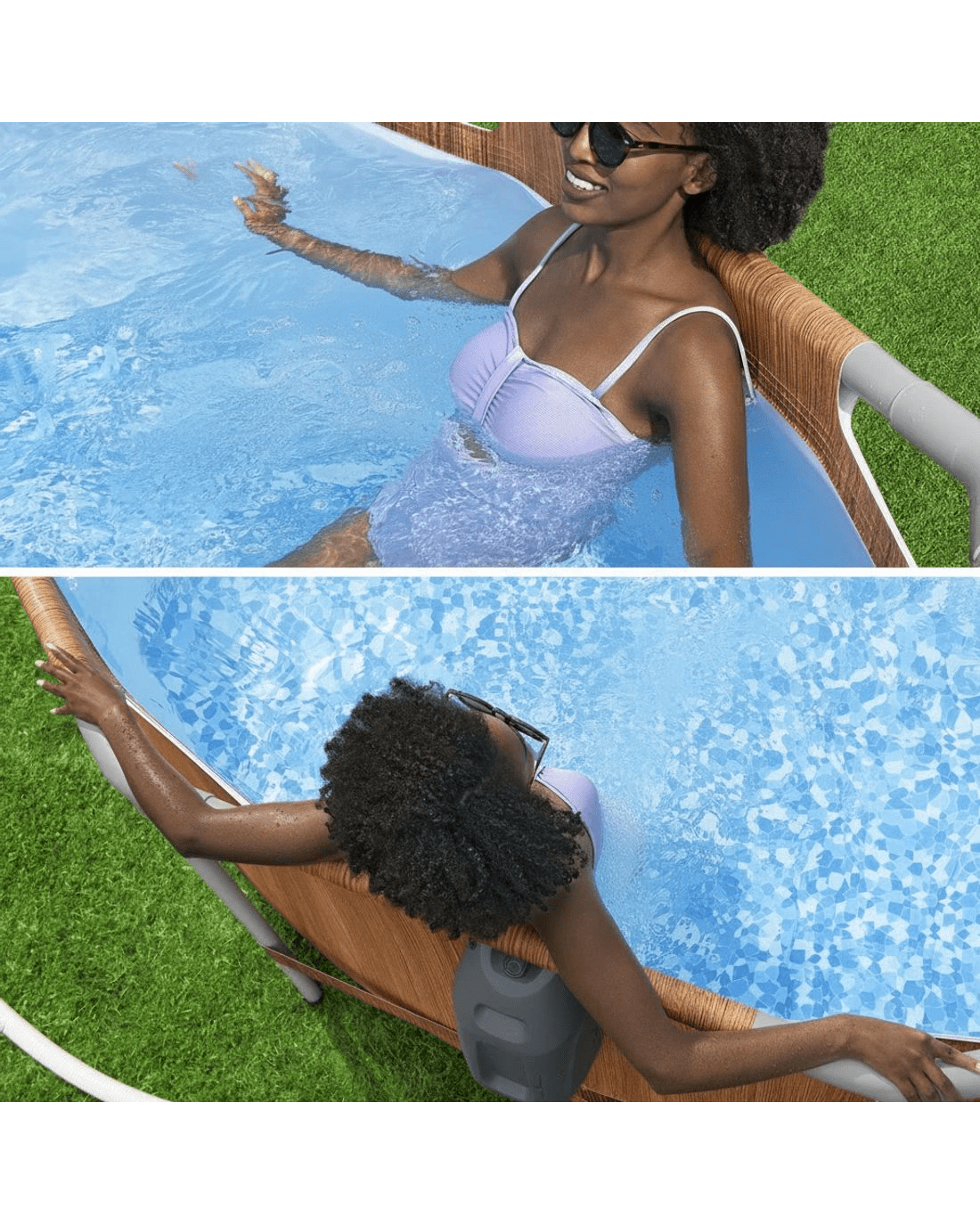 Create your own backyard oasis with this Bestway Steel Pro Max™ luxury pool & spa set! The massive 6.1m x 3.66m (20,241L) pool features 2 Comfort Jet™ massage nozzles and 7-colour LED lighting for ultimate relaxation. Built tough for Aussie conditions with rust-proof steel frame and UV-resistant Tritech® walls. Complete kit includes powerful 2500GPH pump, ladder, filter cartridge and repair patch. Stylish brown woodgrain exterior with Santorini Tile™ interior adds premium appeal. Easy to maintain with standard hose connections. Order now for fast delivery!