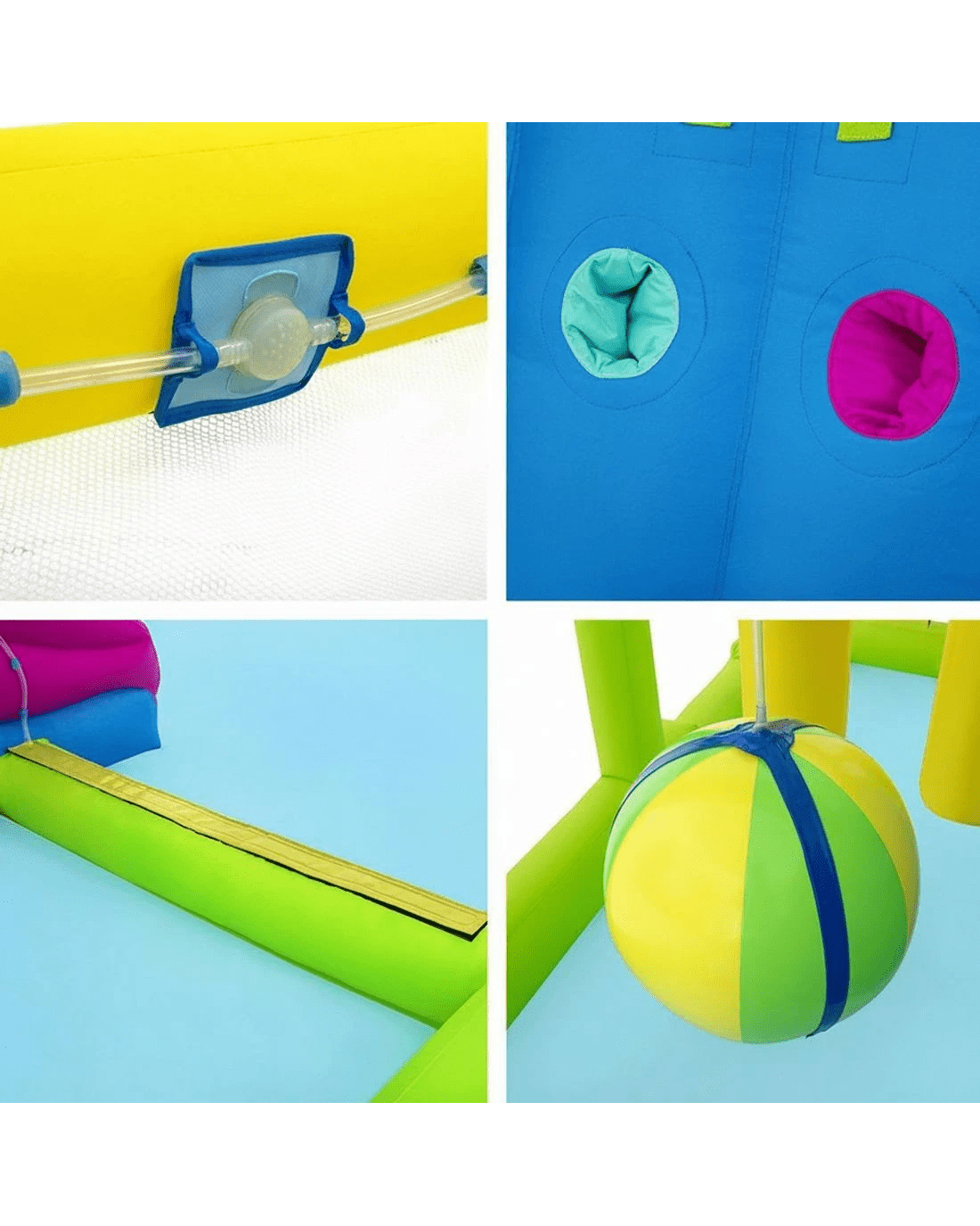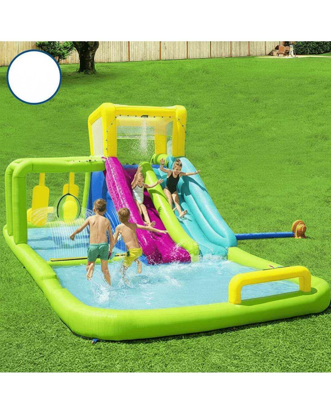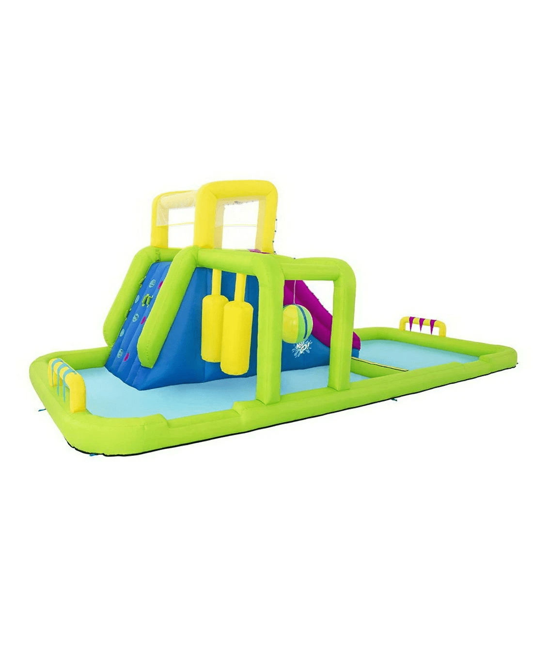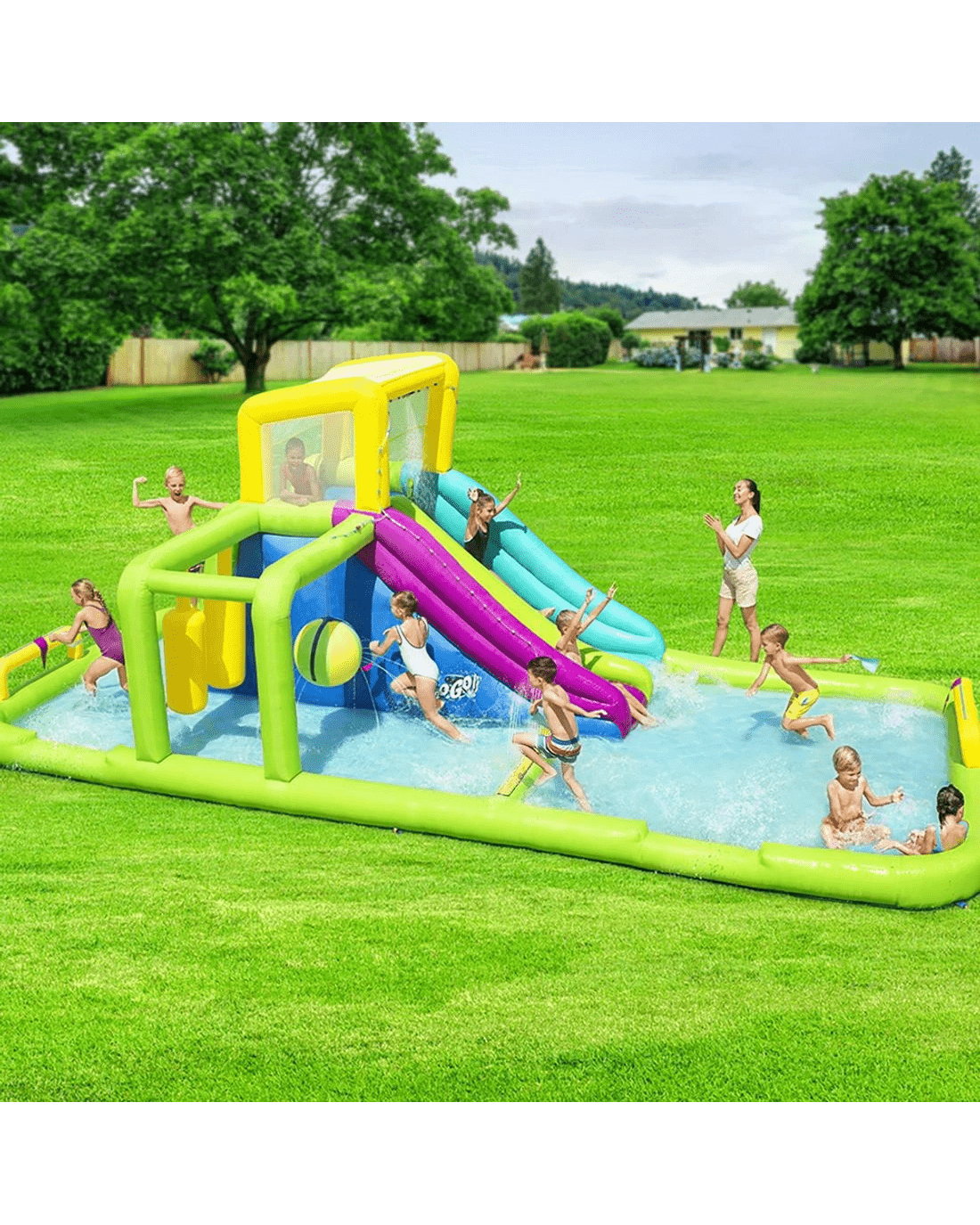 Let the race begin! The H2OGO!® Splash Course Inflatable Mega Water Park is just perfect for kid parties and get-togethers to have a splashing good time racing with each other in a thrilling water obstacle set-up. Kids can speed through the different obstacles, and the park even comes with six flags for team relay races! At the top of the tower, there is a sprayer to keep the slide slick, and mesh walls for added safety. Setting up the water park is hassle-free and the entire water park inflates in less than two minutes, using the included blower.The water park comes in a full-colour box packaging that makes for a great gift idea too.