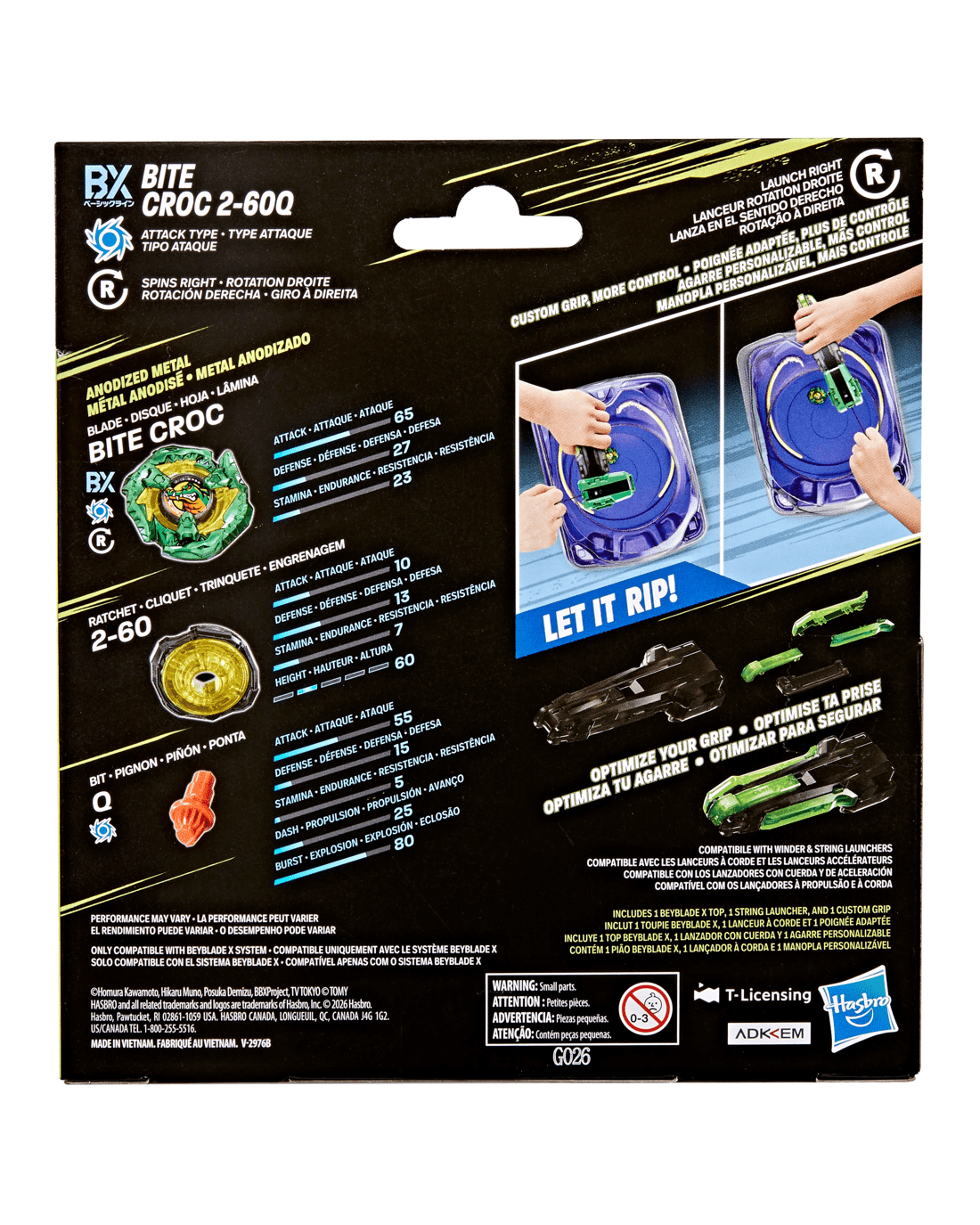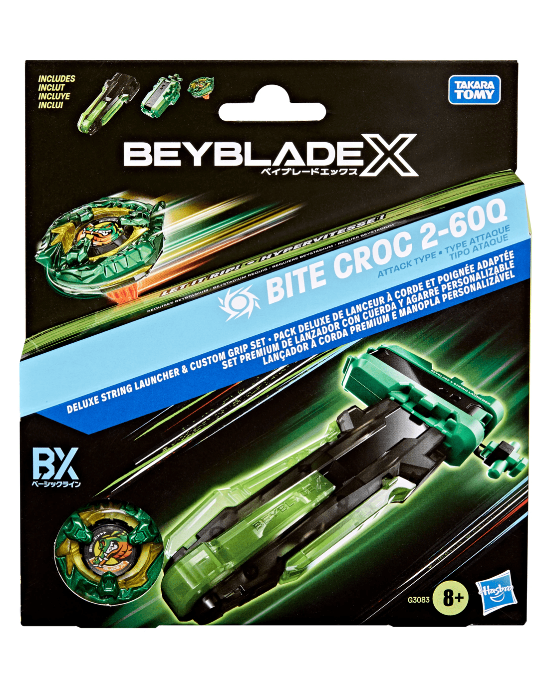 Experience Beyblade X, the next generation of Beyblade stadiums, launchers and tops! The Deluxe String Launcher and Custom Grip Set includes a right-spin launcher, custom grip and Beyblade X top. The grip attaches to the launcher, giving more control of launches, and attaches in multiple ways. The set includes Bite Croc 2-60Q Right-Spin Attack Type top, which works with the X-Celerator Gear System. When the top's gear engages the X-Celerator Rail of a Beyblade X Beystadium (sold separately), it can super-accelerate into an Xtreme Dash around the arena. Bladers launch their top against an opponent's top to score points - first to four points wins. Mix and match the interchangeable blade, ratchet and bit with those of other Beyblade X tops (sold separately) to create your perfect Bey. Grip is compatible with Beyblade X string and winder launchers. Hasbro Beyblade toys with authentic Takara Tomy die-cast metal tops make great kids gifts for boys and girls ages 8 and up.