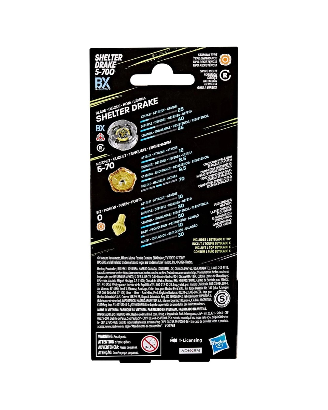 - SHELTER DRAKE 5-70O BX RIGHT-SPIN STAMINA TYPE TOP: Takara Tomy-designed Beyblade X top with authentic, interchangeable die-cast metal blades. The blade's low height allows the top to attack opponents with a single blow from a low position