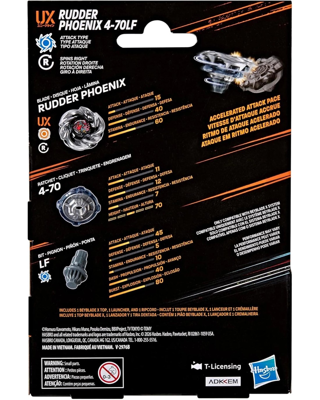 FIND YOUR EDGE WITH BEYBLADE X: Experience the thrill of competition with this fast-paced, spinning top battle toy. Assemble your tops, load your launchers, and 3-2-1 Let it rip! (Beystadium required, sold separately)SPEED INTO HIGH GEAR WITH THE BEYBLADE X X-CELERATOR GEAR SYSTEM: When the gears of the bit and X-Celerator Rail meet, tops rocket forward in an Xtreme Dash for breathtaking bursts and colossal crashes (Only compatible with Beyblade X System)EASY-TO-ASSEMBLE PIECES: The interchangeable blade, ratchet, and bit layers of Beyblade X tops assemble and reassemble with a quick twist leaving you ready to launch into battleINTERCHANGEABLE AUTHENTIC DIE-CAST METAL BLADES: Includes Takara Tomy-designed Beyblade X launcher and top: Rudder Phoenix 4-70LF Right-Spin Attack Type with a Stamina Type Blade. The blade holds down opponents and the bit has high acceleration powerCUSTOMIZE THE CLASH: Launch into head-to-head battles with Beyblade X Beystadiums, launchers, and spinning tops with interchangeable parts! (Each sold separately, subject to availability)COMPETE IN DIGITAL BATTLES: Parents, scan code on your Beyblade X toy tops to take your Beyblade games to the next level! Compete in the Beyblade X app to unleash your tops in a virtual battle with other Bladers worldwideItem Specifics