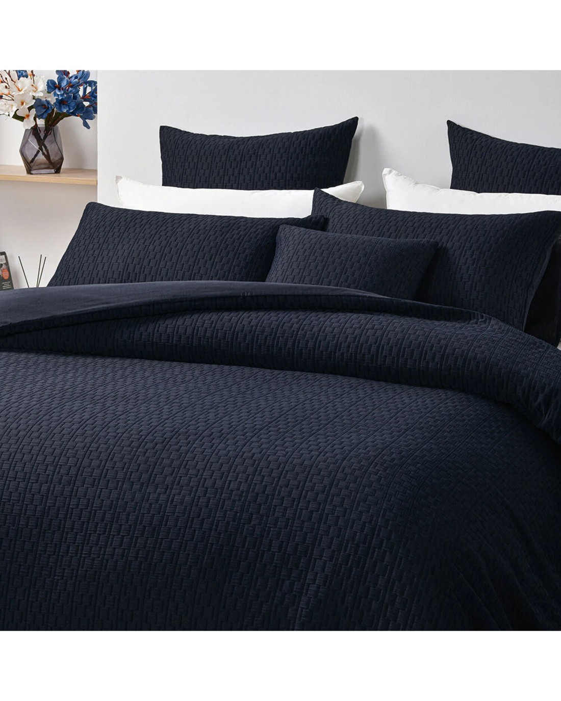 This quilt cover set features a soft to touch, easy care fabric made from polyester and polyester/cotton blend, ensuring durability and low maintenance. The elegant ink colour complements a variety of bedroom decors, creating a timeless and versatile look.