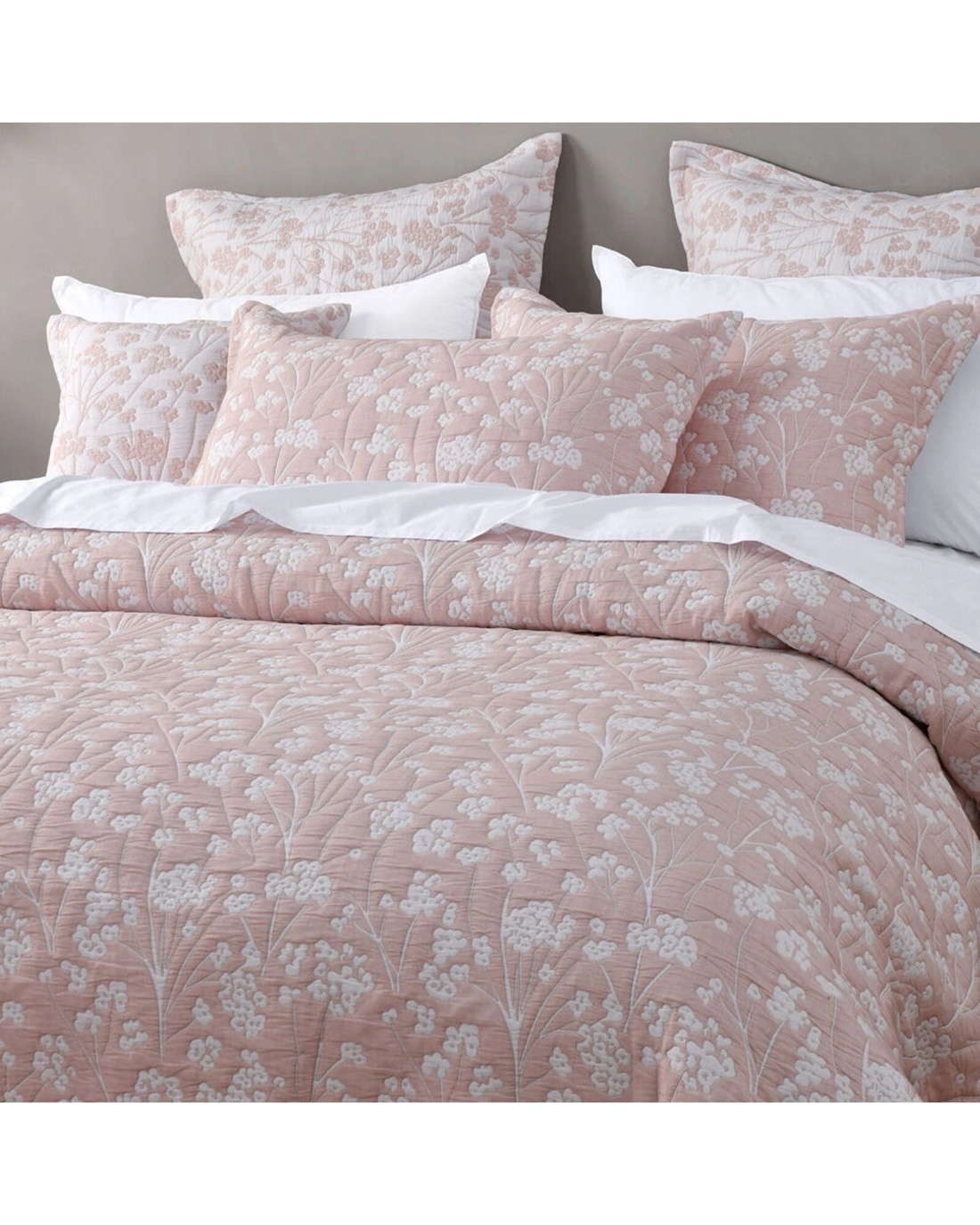 This elegant set features petite white floral patterns scattered across a gentle blush background, enhancing your bedroom decor with a subtle, graceful aesthetic. The coordinating European pillowcases and cushions reverse the palette with blush florals on a white base, adding visual interest and contrast to your bedding arrangement.