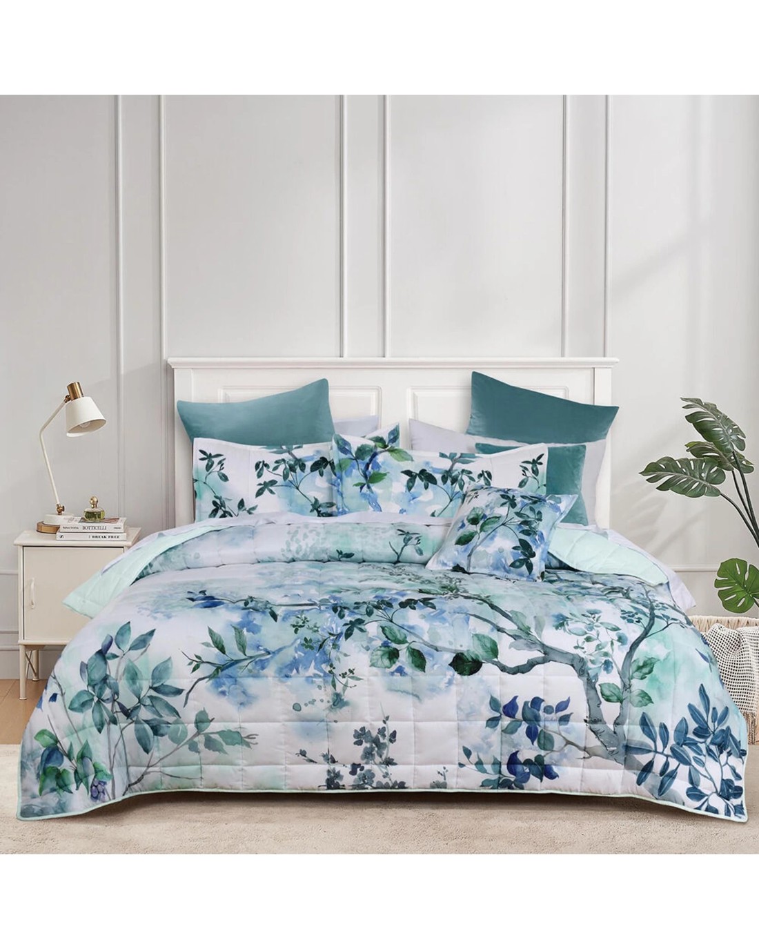 The Bianca Woodbury Queen Poly Bedspread & Pillowcase Set is designed for creating a stylish and calming bedroom environment. This complete bedding set features a beautifully quilted bedspread with a graceful leafy botanical design in soothing blue and green shades, complemented by tailored pillowcases and cushions for a polished look.