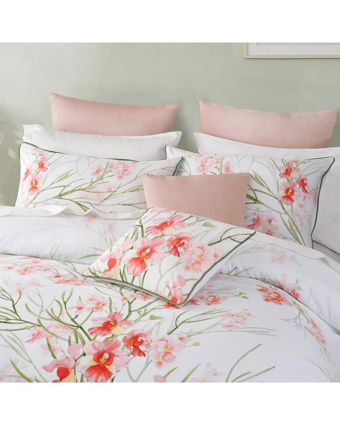 Featuring a delicate floral design with pink flowers and green stems on a crisp white background, it creates a fresh and inviting atmosphere in your space. The set includes a quilt cover and two matching pillowcases, all finished with piped edges for a refined and sophisticated look.
