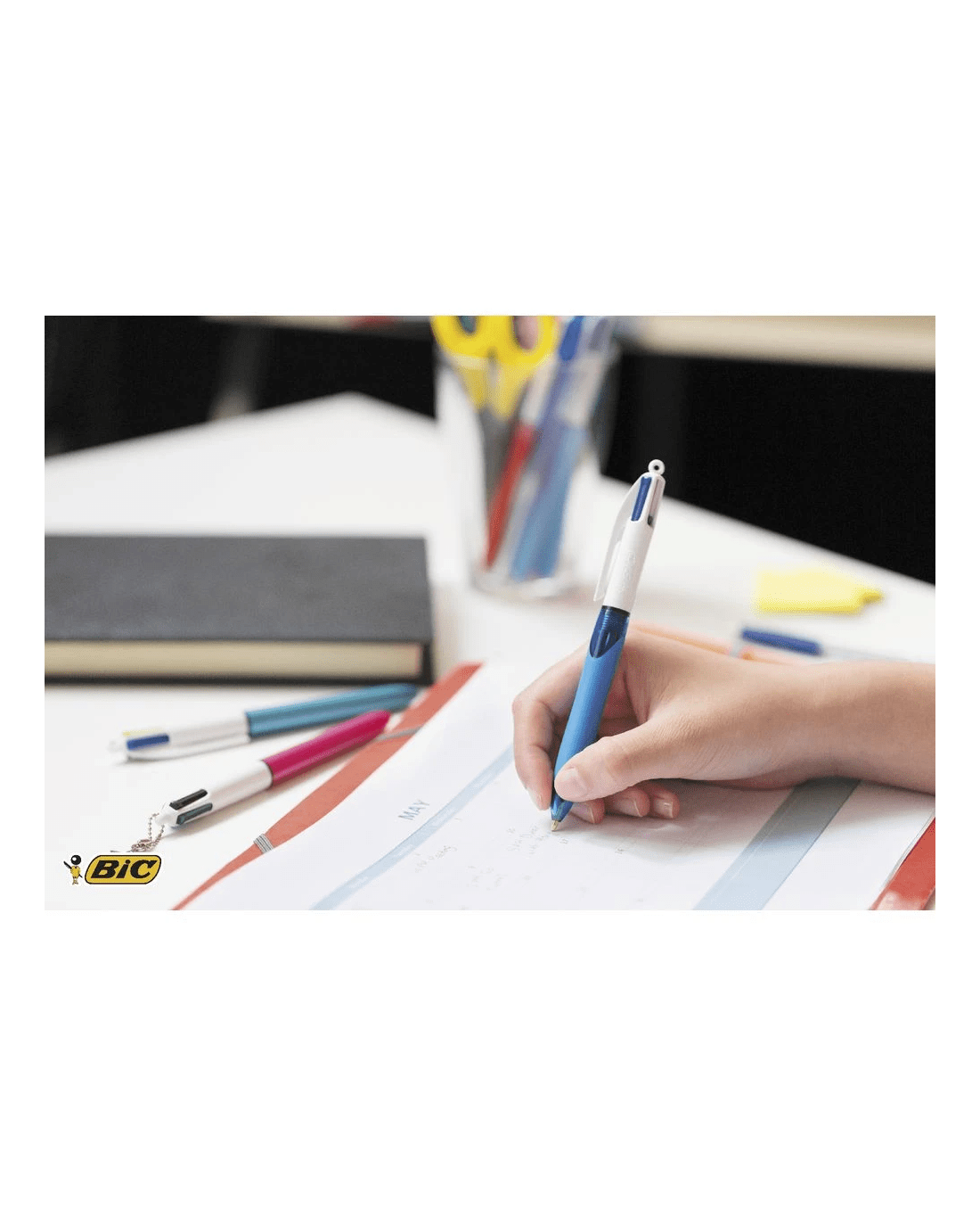The classic BIC 4 Colour Pen now comes with a modernised look. The BIC 4 Colour Grip Fine Retractable Ballpoint Pen has a rubberised grip to aid in comfort, and a ring at the top so it can be placed on a lanyard. This pen is perfect for recording data in different colours, without having to constantly change pens. The fine nib offers a smooth and consistent writing experience.