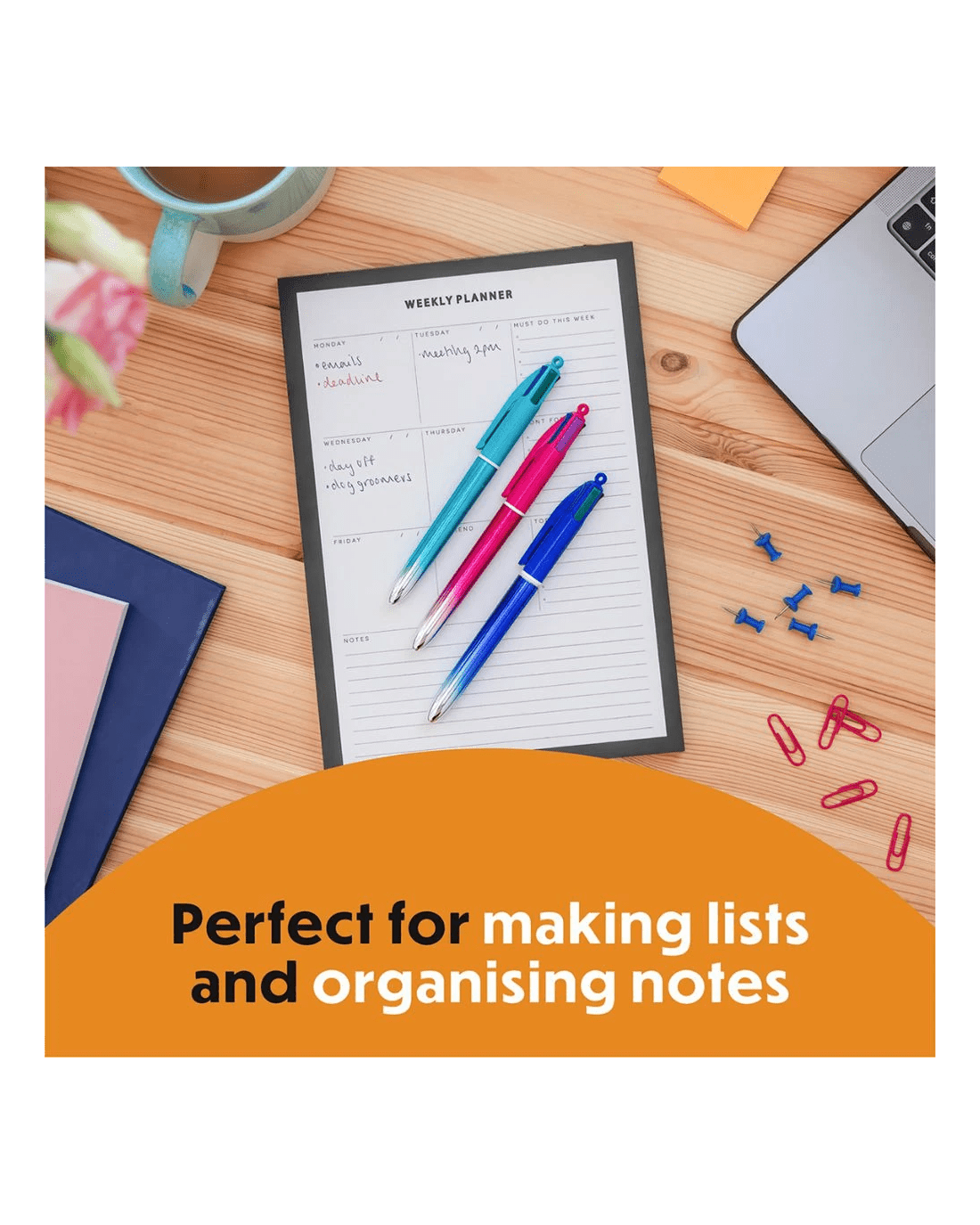 This Bic Ballpoint Pen is an easy-to-use companion for all your writing tasks. It provides 4 colour option you can access with a simple click function, allowing you to write, edit, mark, and organise all of your notes.