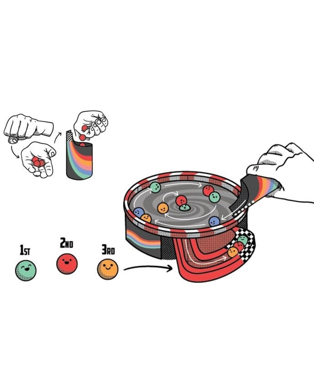 You must try to get as many top three finishes as you can. The higher you finish, the more points you get to bank. If you're stuck in last place, unleash the Thunderball racer to power you back up the leaderboard. The player with the most points after eight races is crowned Whirly Derby Champion of Champions. How to play: 1. Everyone secretly chooses how many marbles they want to enter into the race. 2. RACE TIME! Tip all the marbles out of the marble launcher and watch them race⦠3. PICK YOUR POINTS! The player who won the race now chooses any trophy card from the line-up of three. 2nd place picks next. 3rd place must take the last card on offer. The player with the most points after eight races is crowned Whirly Derby Champion of the Whirlyverse. Ages: 8 + | Players: 2 - 6 | Playtime: 10 mins +