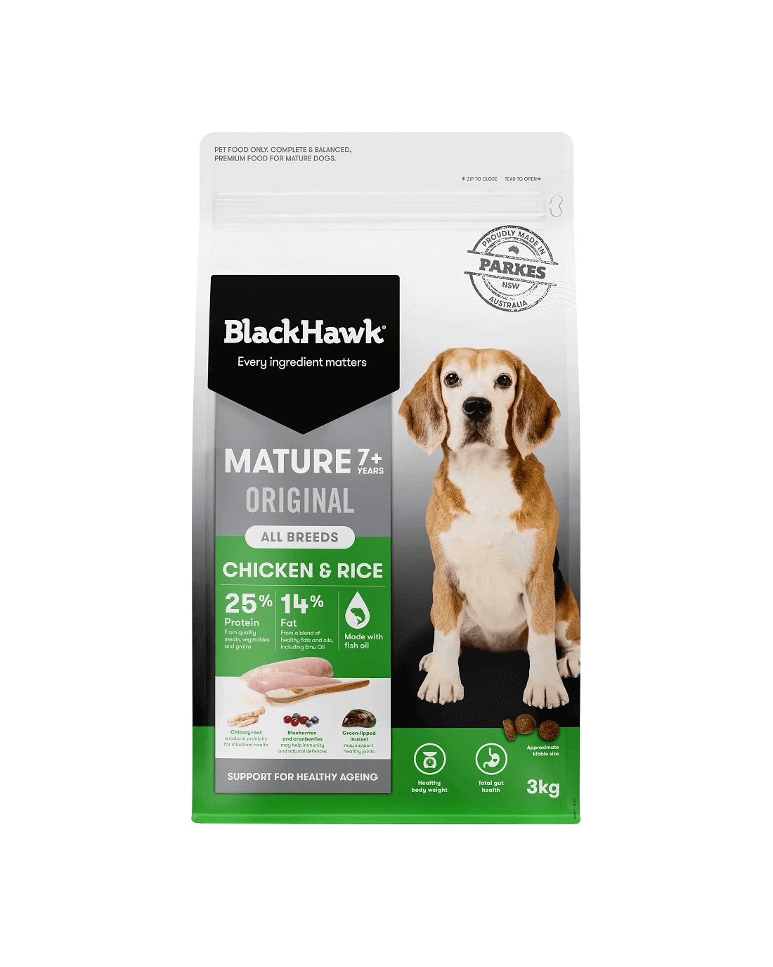 Created with expertise from animal nutritionists and vets, this unique recipe includes a range of other important ingredients to support your dogs healthy ageing. Black Hawk Original Mature contains chicory root, a natural prebiotic for intestinal health; blueberries and cranberries, which may help immunity and natural defences; and green-lipped mussels which may support healthy joints. Sweet potato is also included as a rich, natural source of fibre that can support your dogs digestive health and assist with the absorption of vital nutrients.