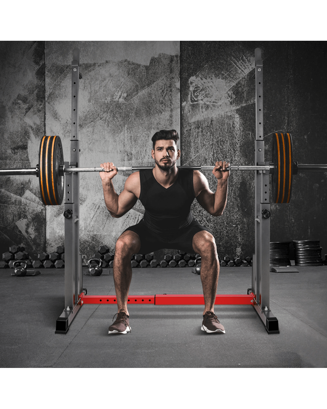 The upper rack can be adjusted to 6 height positions and the barbell holder in the middle can also be adjusted to 7 height positions, so as to fit each person's height and the adjustable base width can better meet your exercise needs. You could have it as low as it will go into bench presses and then raise it up to a high position for squats. In the meantime, this squat rack features safety spotter arms, which will bring peace of mind to your workout. Best of all, these spotter arms also come with rubber pads to reduce noise when you drop the bar, and protect your barbell from damage.