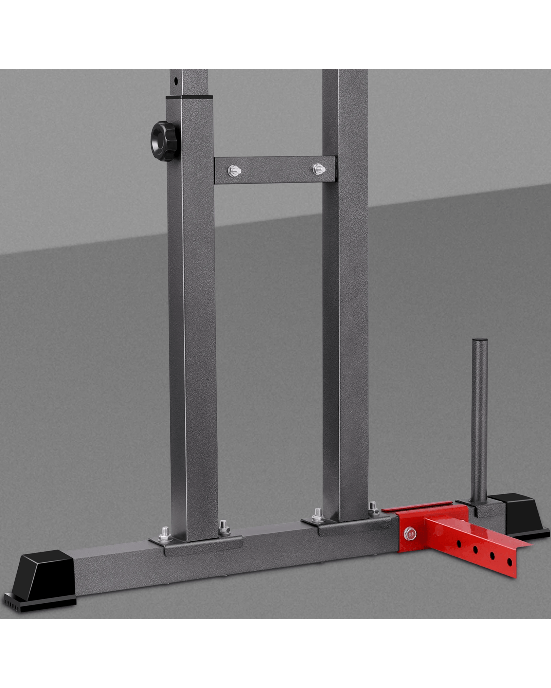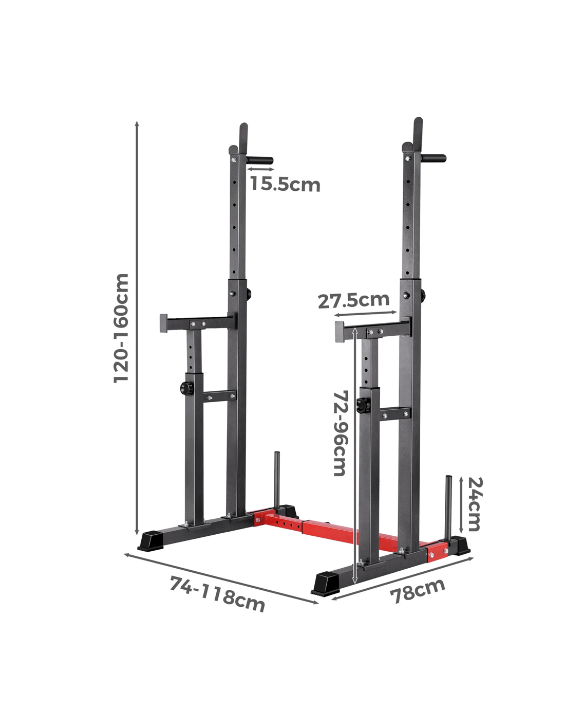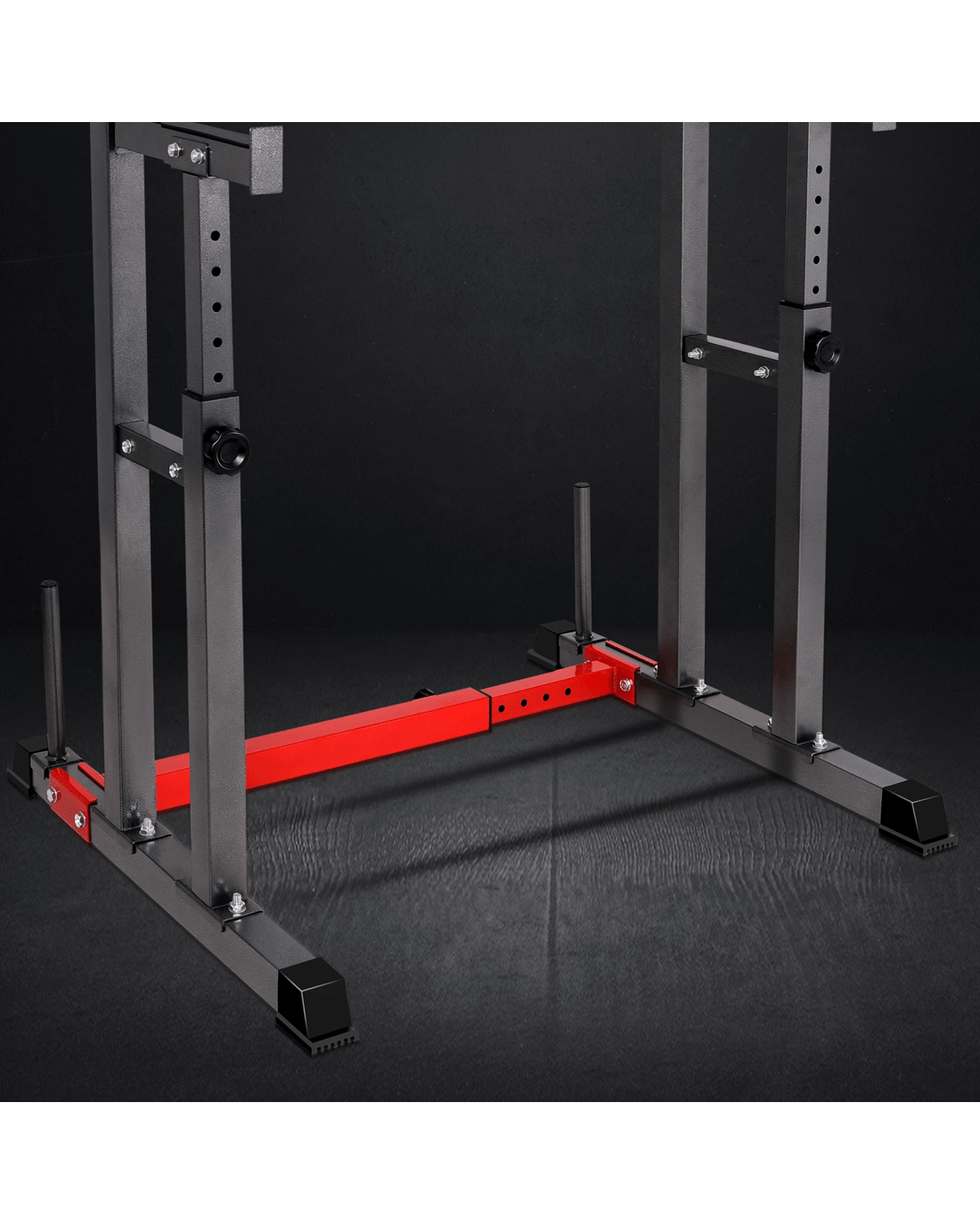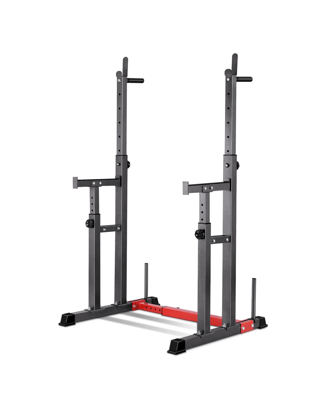Constructed from quality steel, the squat rack is designed to be durable with 300kg weight capacity and offers rock-solid stability. The gorgeous powder-coated paint job will keep it looking fresh for years to come. Crafted with safety in mind, the rack is also equipped with sturdy rubber feet to keep the metal frame from damaging flooring and to keep the rack in place.
