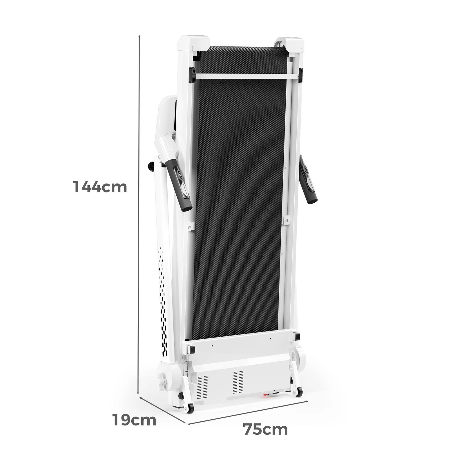 This treadmill features a fully foldable design and portable wheels, making it easy to fold up and move. You can conveniently store it under the sofa, bed, or against the wall in your favor to save space.