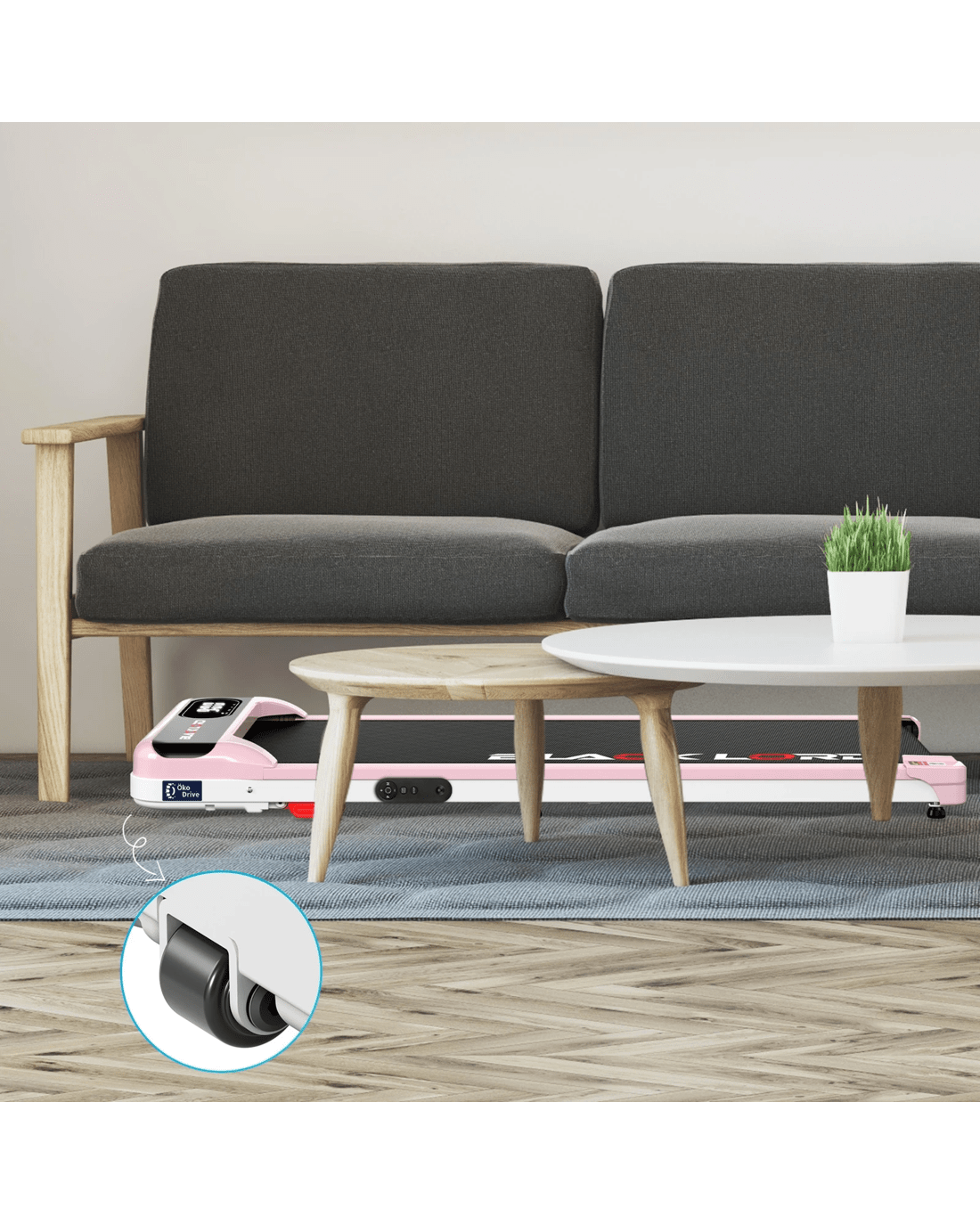 The unique portable wheel design makes it a breeze to move around and store it under the sofa or bed. Compact yet powerful, this walking pad fits seamlessly into your lifestyle. Whether you're working at a standing desk, watching TV, or squeezing in a quick exercise session, this walking pad helps you stay active without interrupting your day.