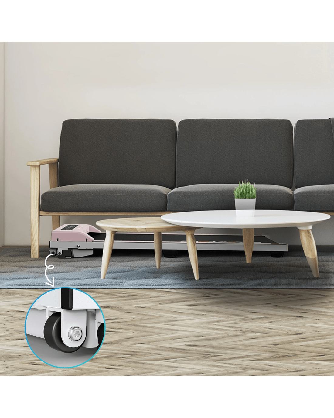 The unique portable wheel design makes it a breeze to move around and store it under the sofa or bed. Compact yet powerful, this under desk treadmill fits seamlessly into your lifestyle. Whether you're working at a standing desk, watching TV, or squeezing in a quick exercise session, this walking pad helps you stay active without interrupting your day.