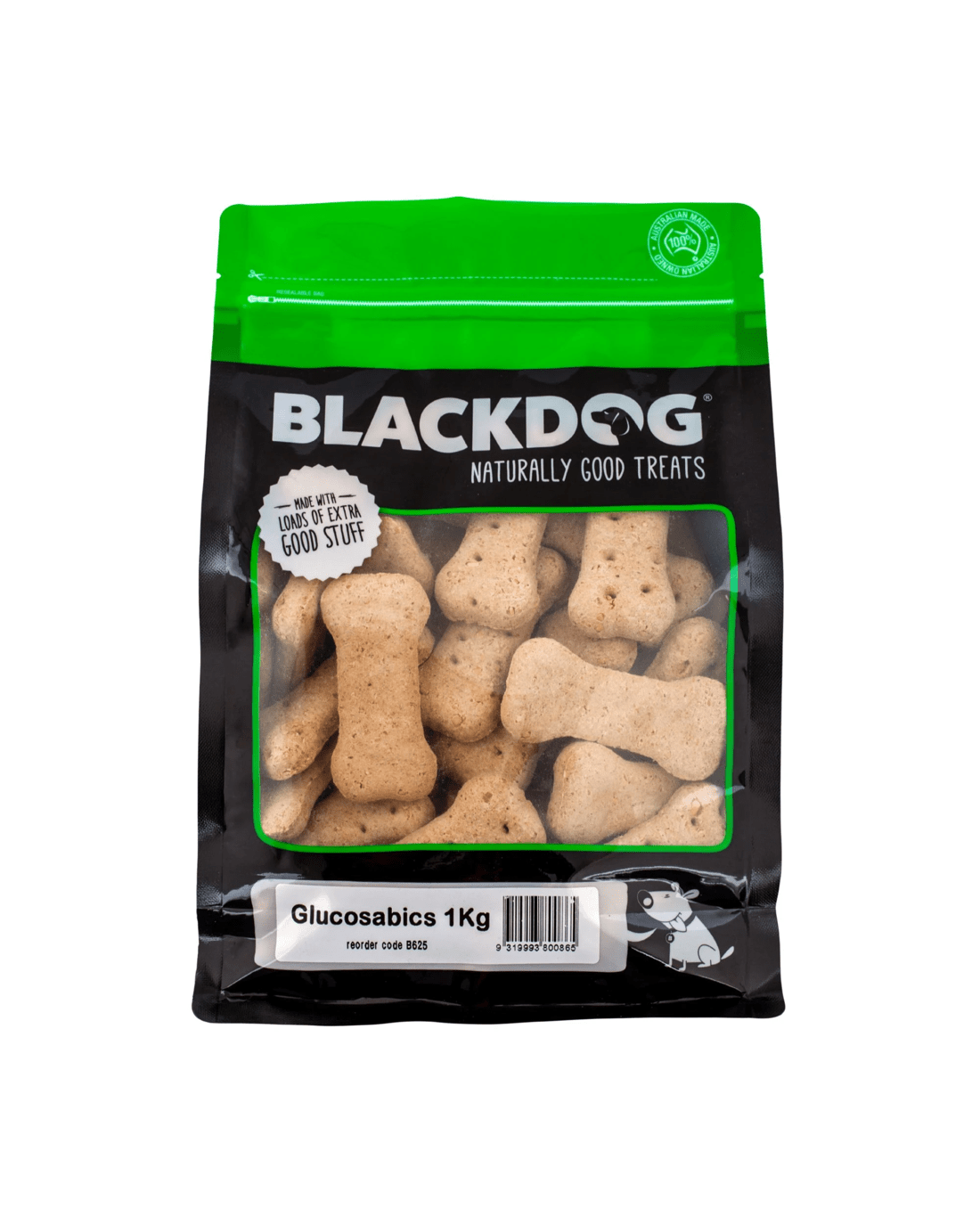 Blackdog Glucosabics are oven baked dog biscuits formulated with added glucosamine to support joint health and mobility. They combine functional ingredients like omega oils, antioxidants, and vitamins to aid cartilage repair and overall wellbeing. Made in Australia, these crunchy treats are both tasty and beneficial for long term canine health.