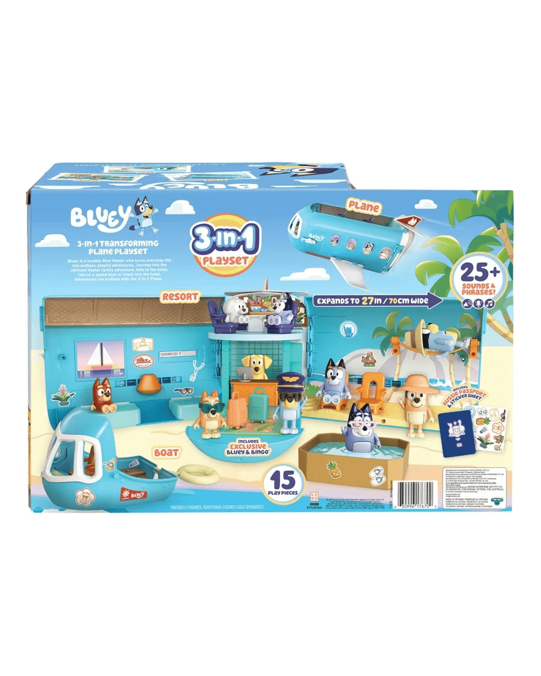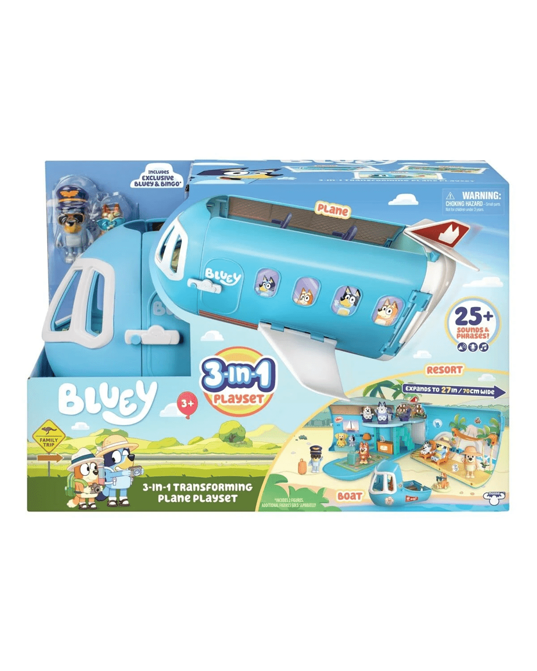 Features- The Bluey 3-in-1 Transforming Plane Playset! Transforms easily from a plane into a resort and a boat