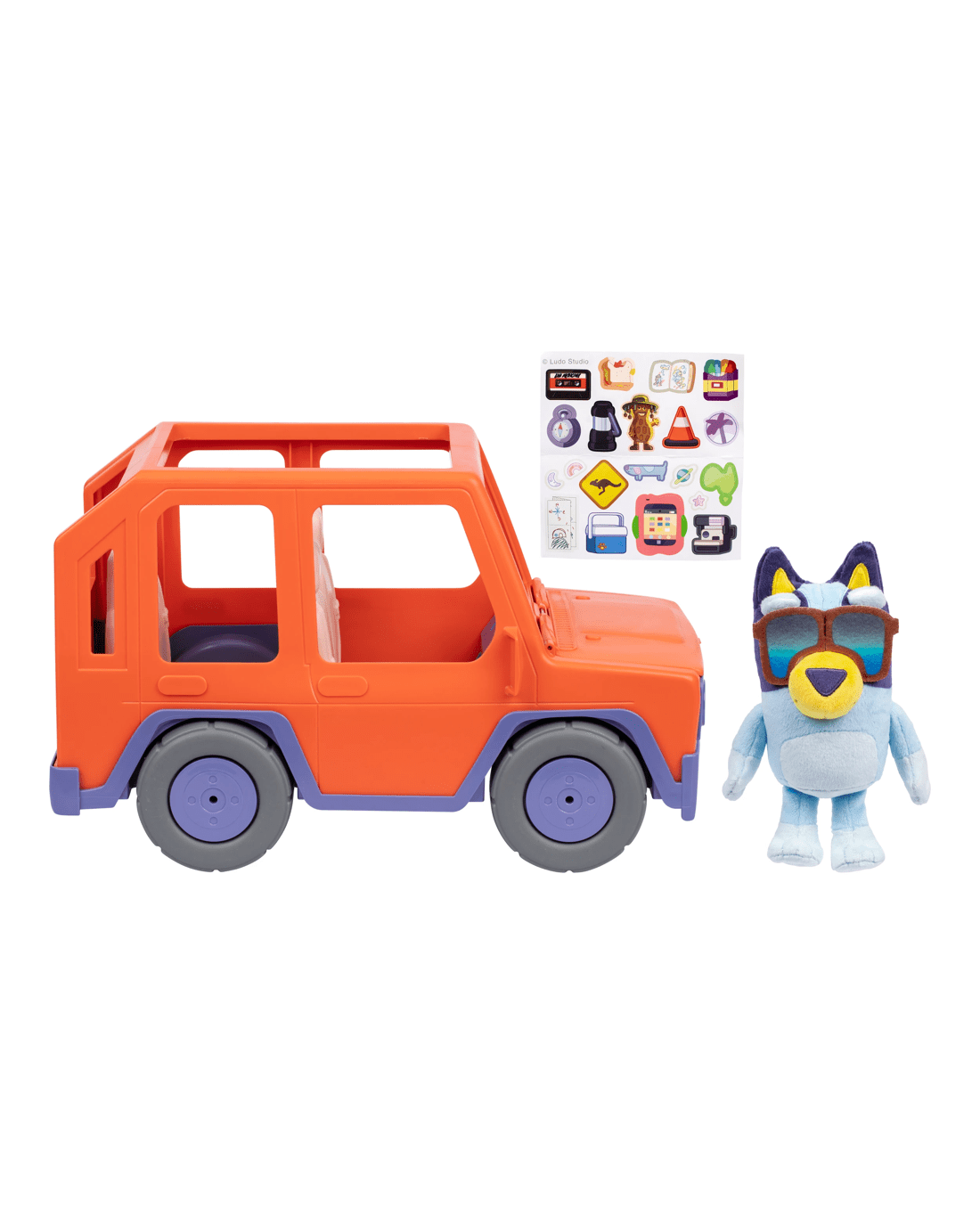 Now Bluey fans can take their Bluey plush toys on a road trip in this mega-sized family Heeler 4WD. The Bluey Buddies Big Heeler 4WD car easily fits up to four Bluey Friends plush and includes an exclusive 8-inch plush Bluey wearing her sunnies. Bluey is made of super soft plush with deluxe fabrics and embroidered details. Lift up the hood of the car to find more storage. Also includes a fun sticker sheet so kids can decorate and customise their ride. Plus, there is a cute hangtag with a bunch of activities for little ones to do. Sturdy and strong, the Bluey Buddies Big Heeler 4WD is ready to roll out across Brisbane fun for hours and hours!