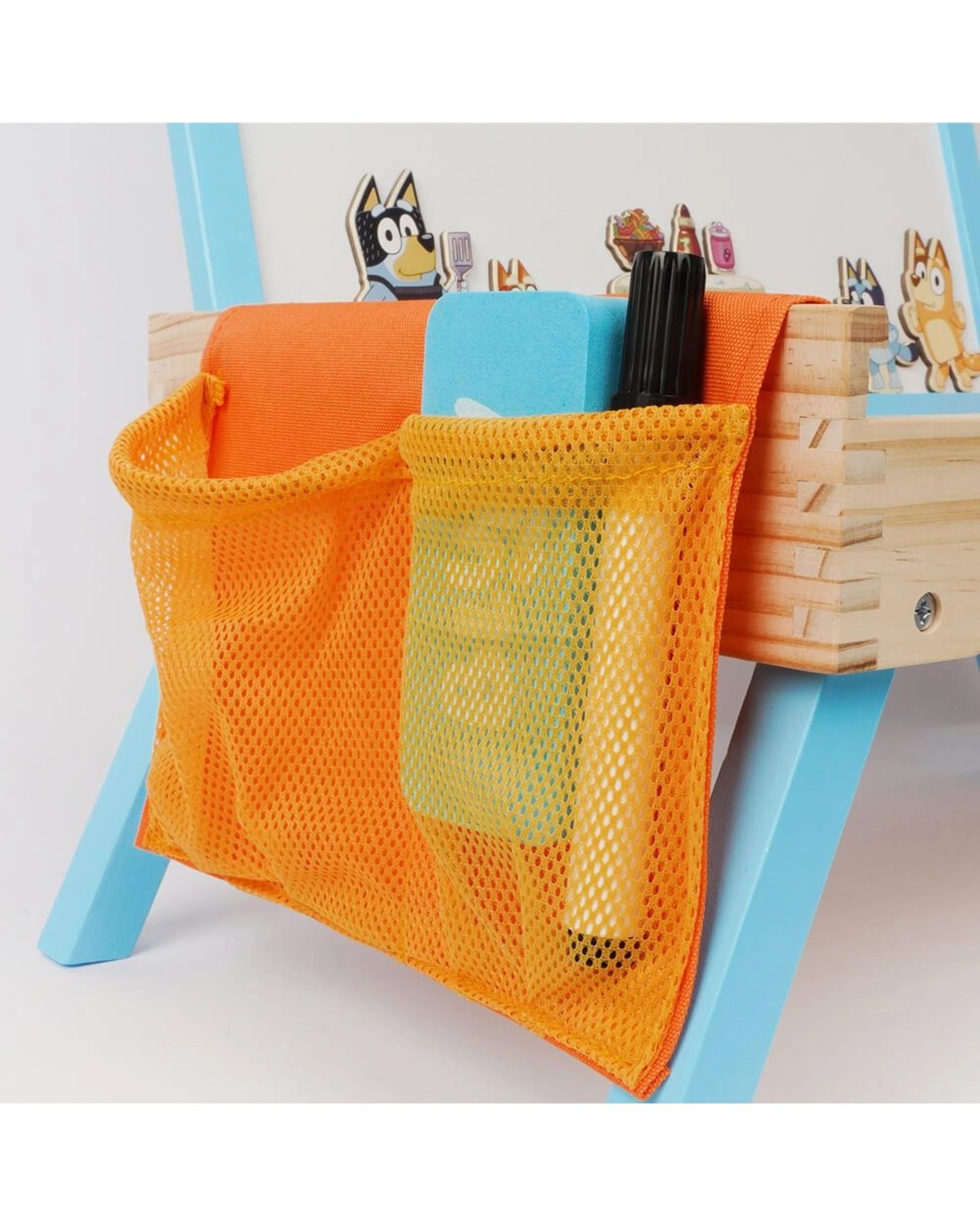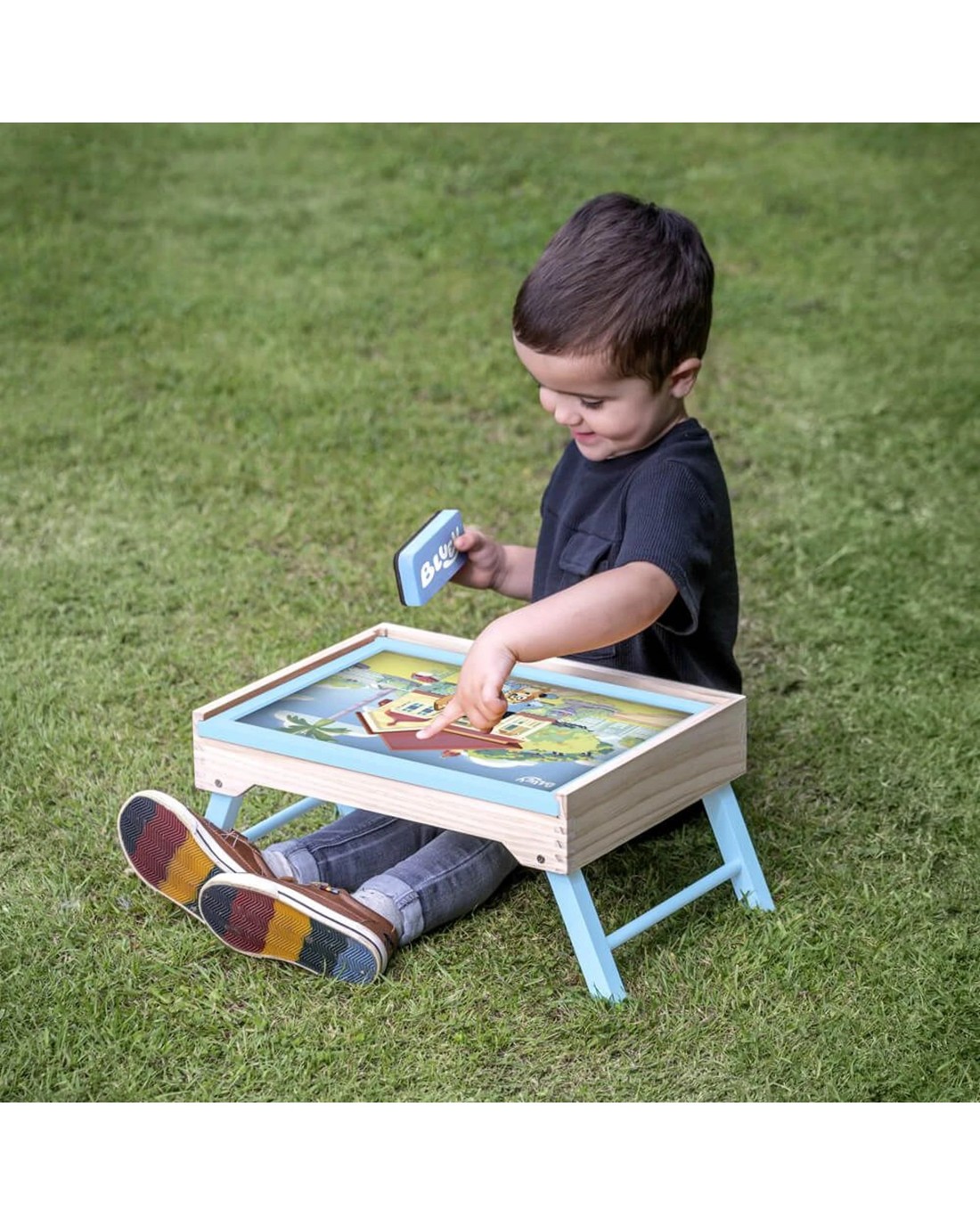 Inspire your little one's imagination with this Bluey Creation Station! Get creative with Bluey and her friends. Colouring and drawing are examples of what your Bluey loving little one will spend hours enjoying. With 100 magnets, children can create their own Bluey scenes with their favourite characters. With a removable whiteboard lid, children can draw on the 4 activity sheets included. Not only this but the tray's folding legs accommodate them on the go, whether it's for entertainment on a long journey or to use in their bedroom. The canvas pockets are also handy to store all the magnets away. Ages 3 +
