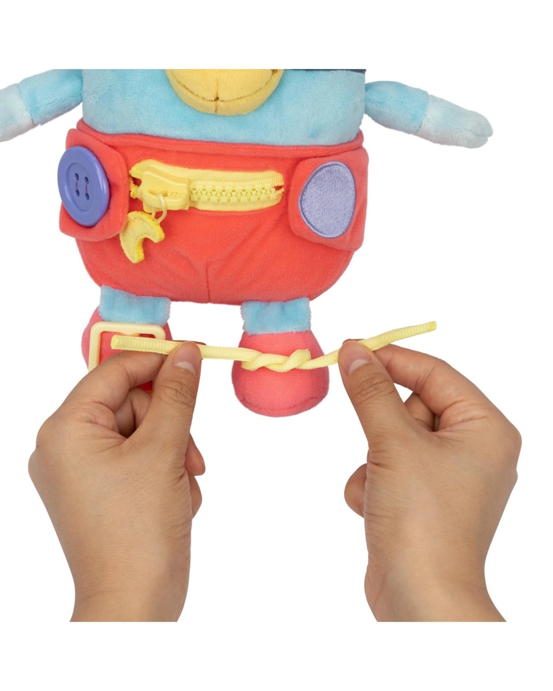 Now your child can have fun learning how to dress with Bluey! Dress & Play Baby Bluey is designed for your little one to practice their fine motor skills. Baby Bluey wears a diaper with buttons and a zipper, and shoes with a buckle and shoelaces - making it a fun, hands-on way for toddlers to learn how to button, zip, buckle, and tie through play. At 10" / 25.4 cm tall, Baby Bluey is just the right size for little learning fingers. Kids will love to get Bingo ready for a new adventure every day! Made from super soft plush with deluxe fabrics, Dress & Play Baby Bluey is perfect for cuddles and play. Ages 3 +